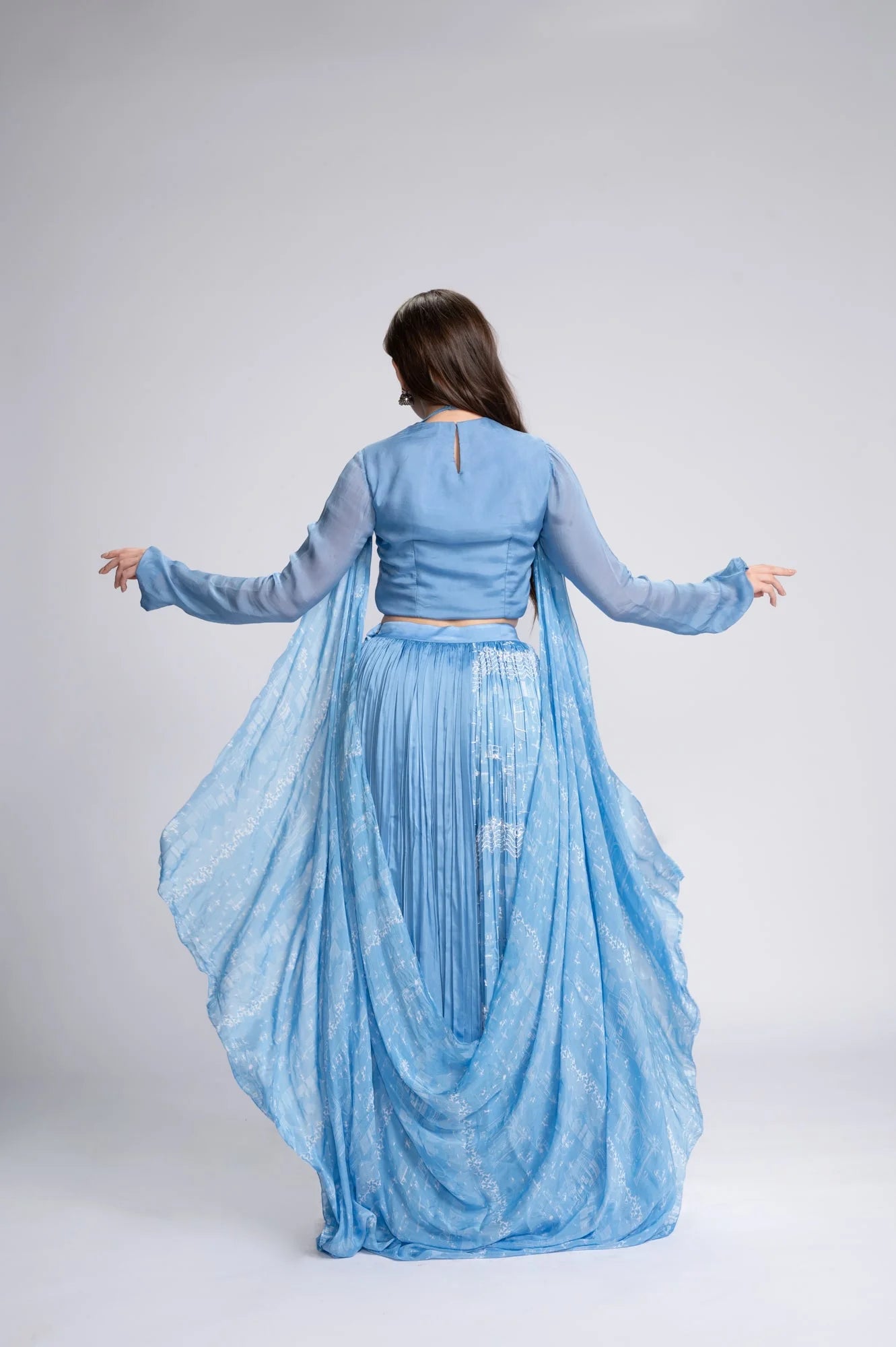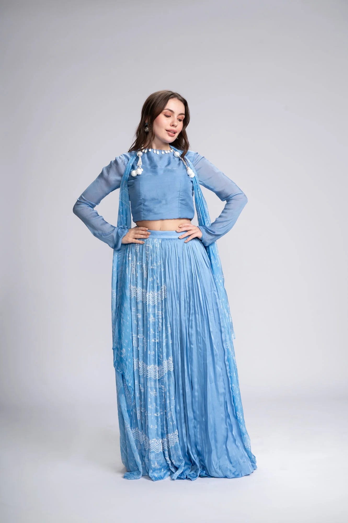 | Featuring a moonstone blue lehenga set in satin base with beads and cutdana hand embroidery. With warli art printed digitally it is embellished with kaudi, cones and tassles. It is paired with a matching crew neck blouse and cape in tabby silk. |