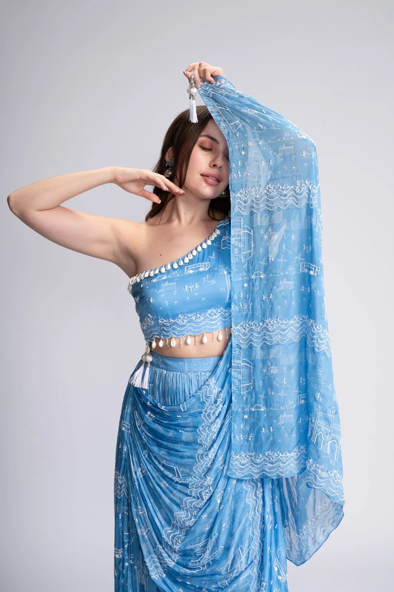 | Featuring a moonstone blue pre-draped saree in tabby silk with warli art print. Hand embroidered with beads and cutdana, it is paired with a matching one shoulder blouse and embellished with kaudi, tassles and cones. |