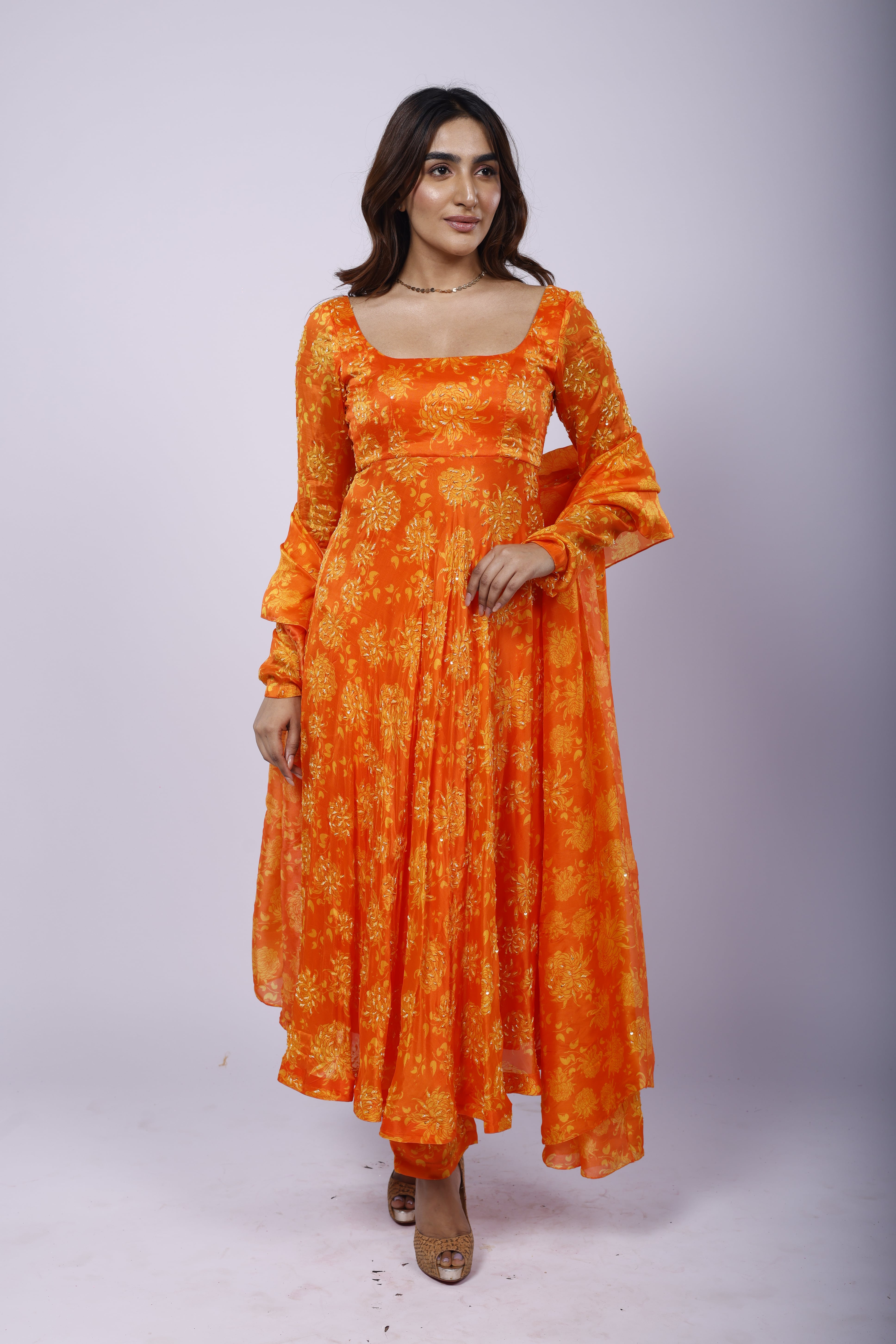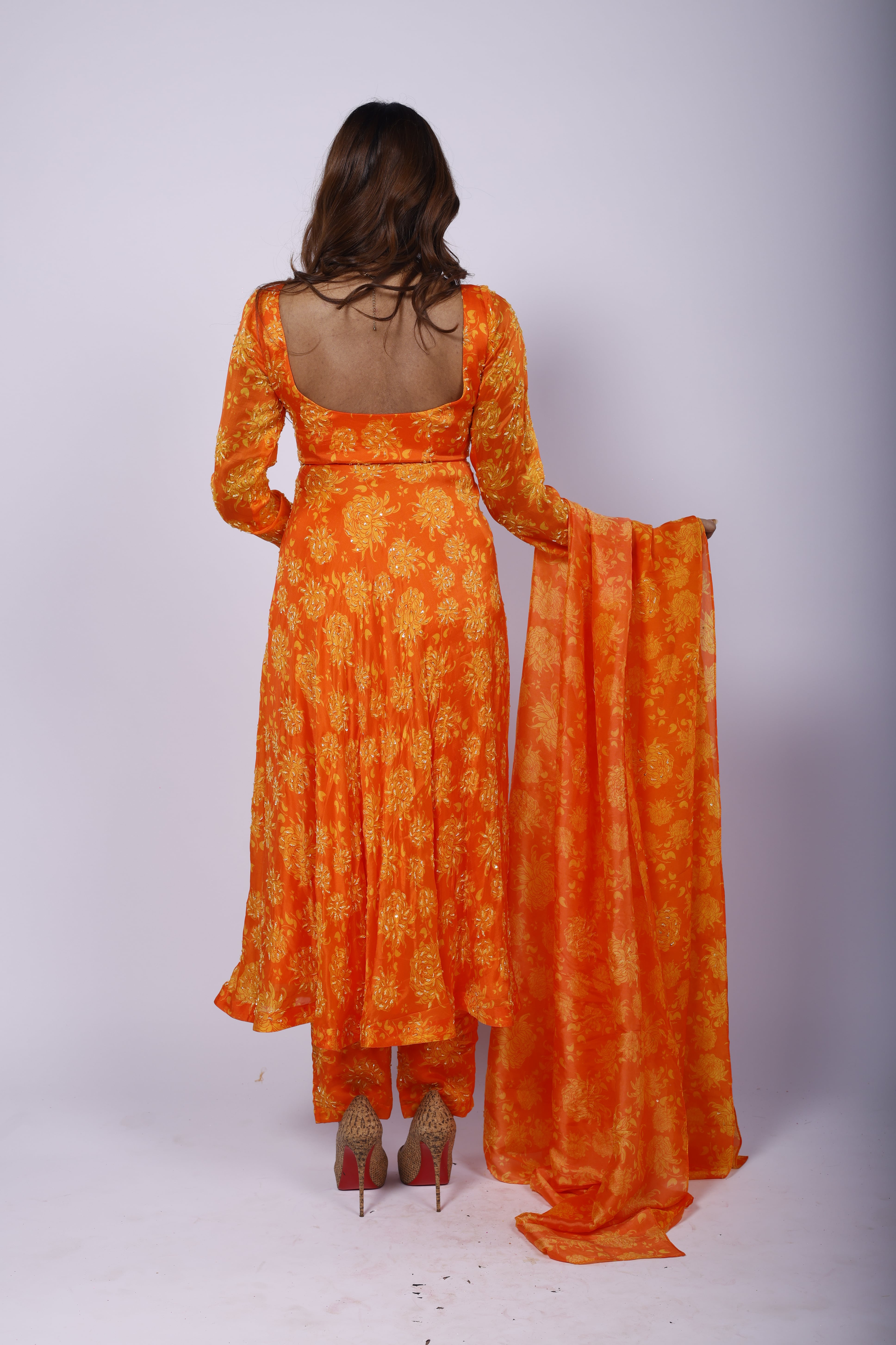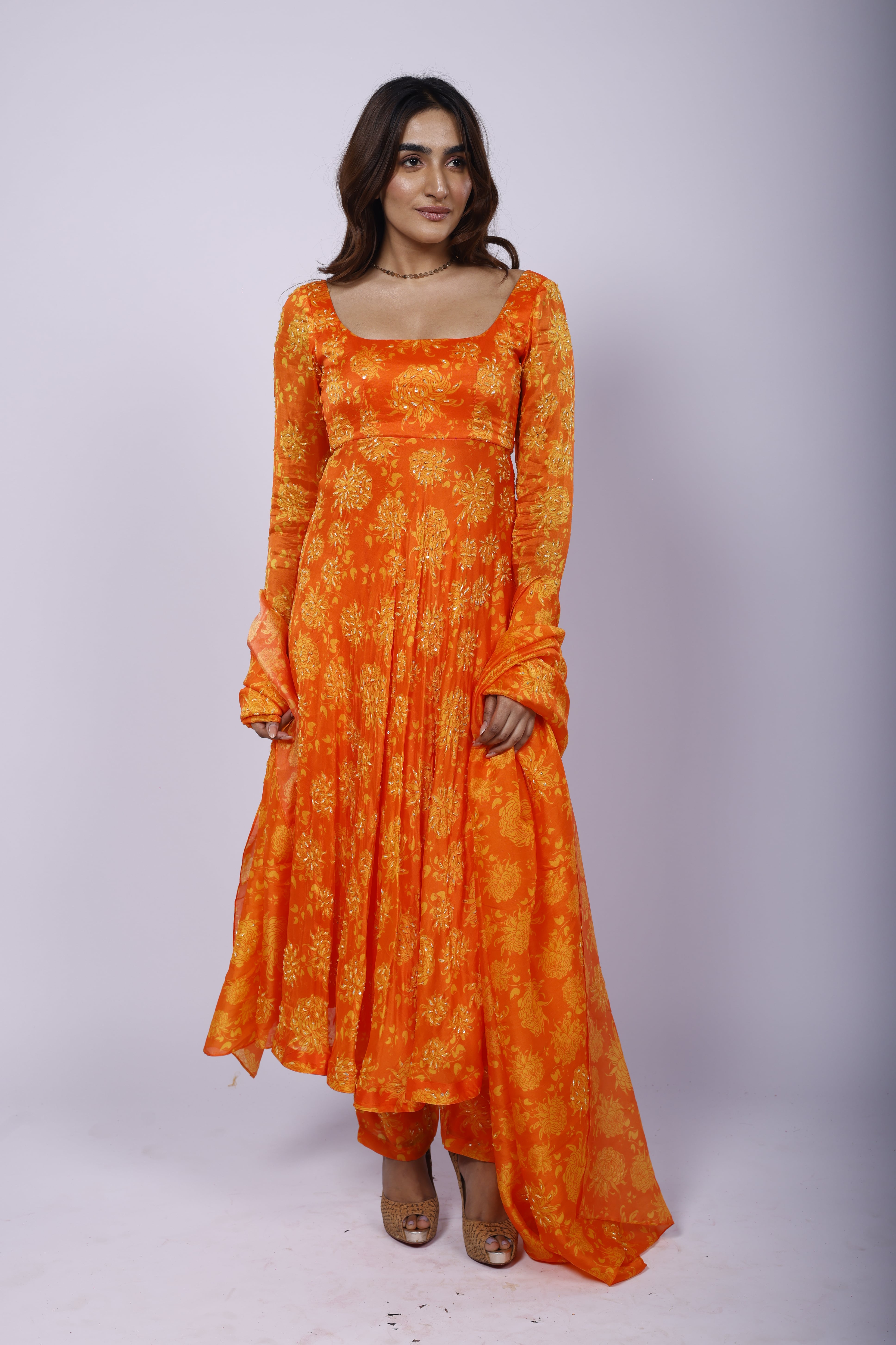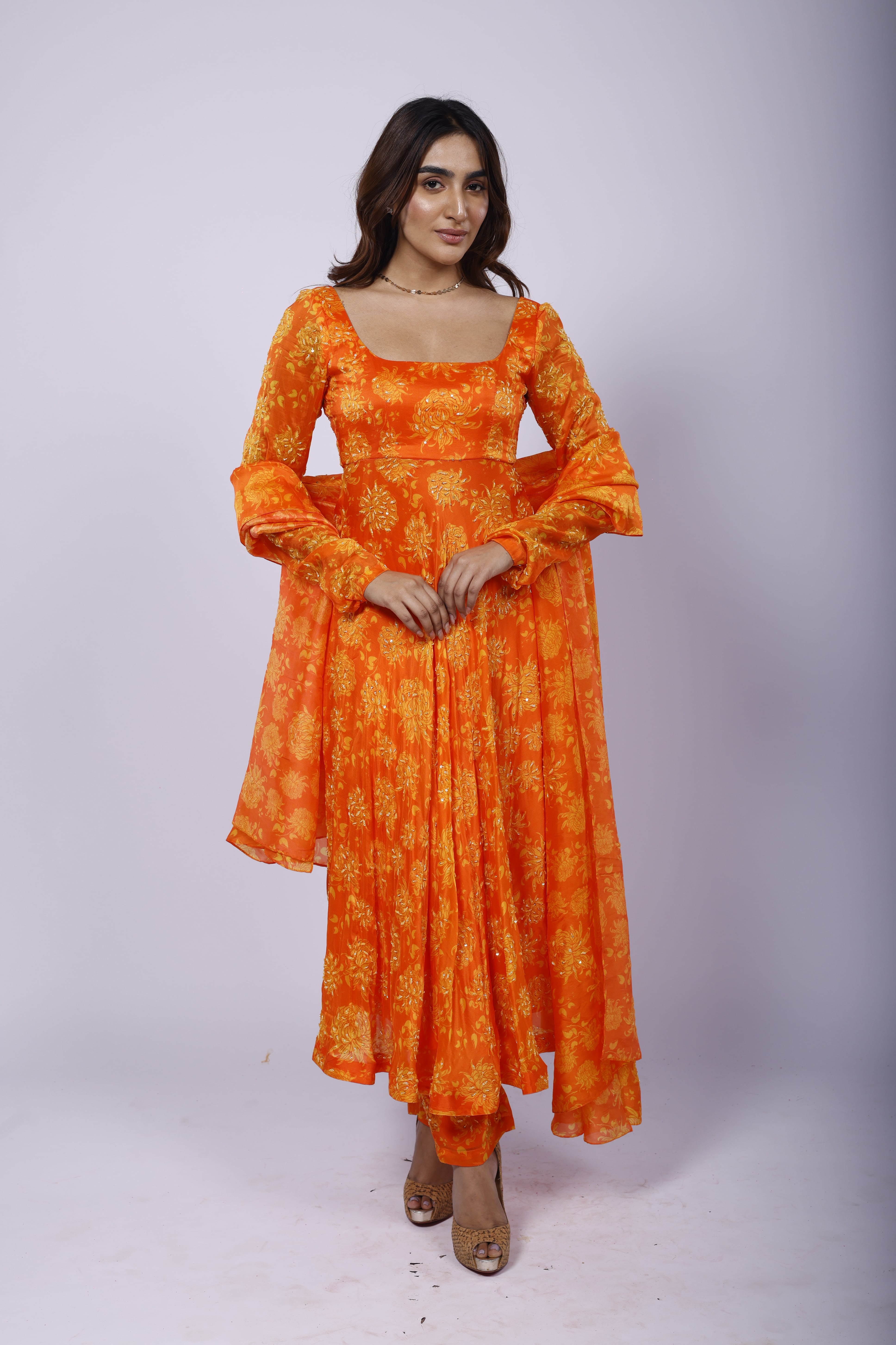 Featuring a marigold orange anarkali set in organza with Genda Fool print. Hand embroidered with cutdana and sequins, it is paired with matching dupatta. |