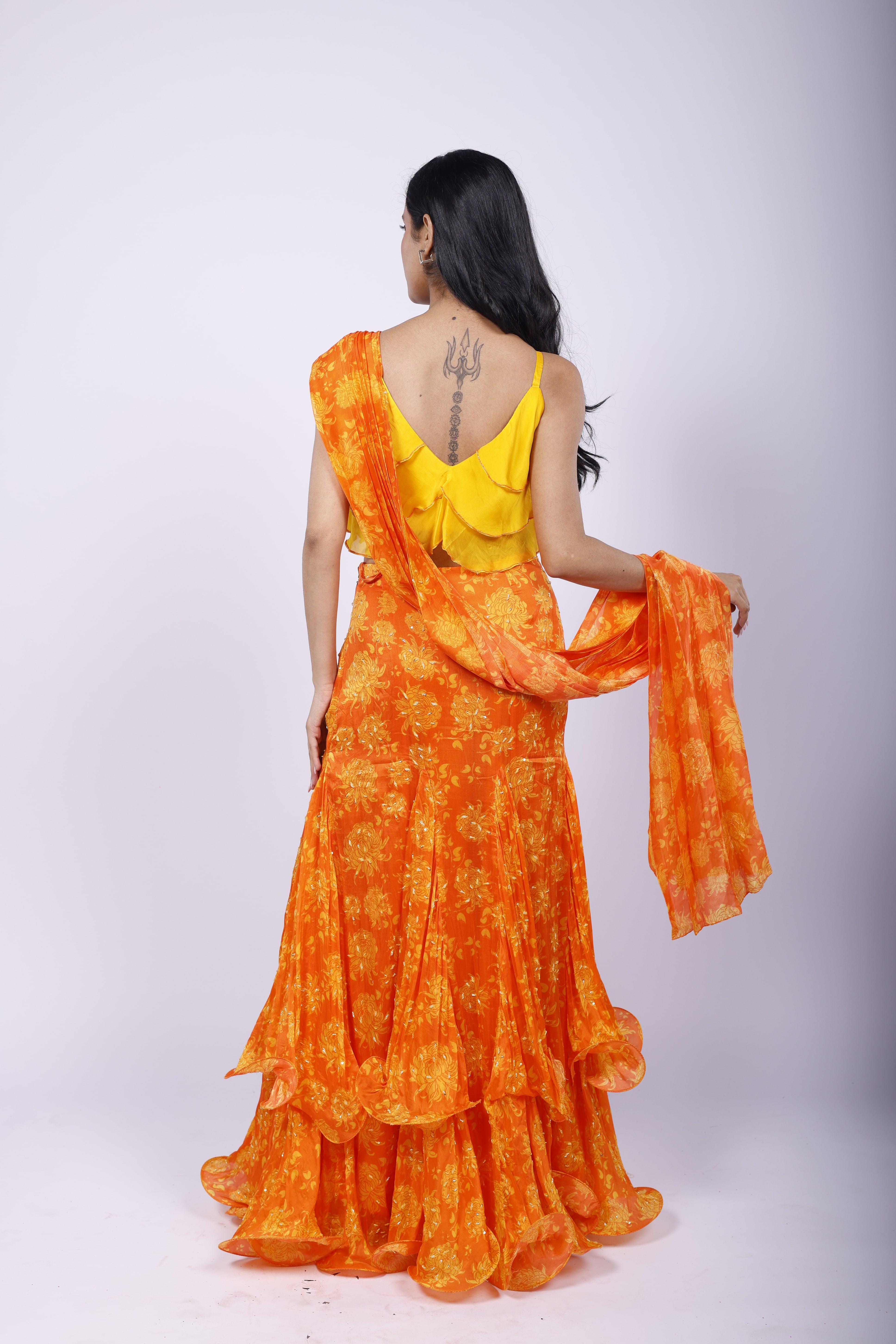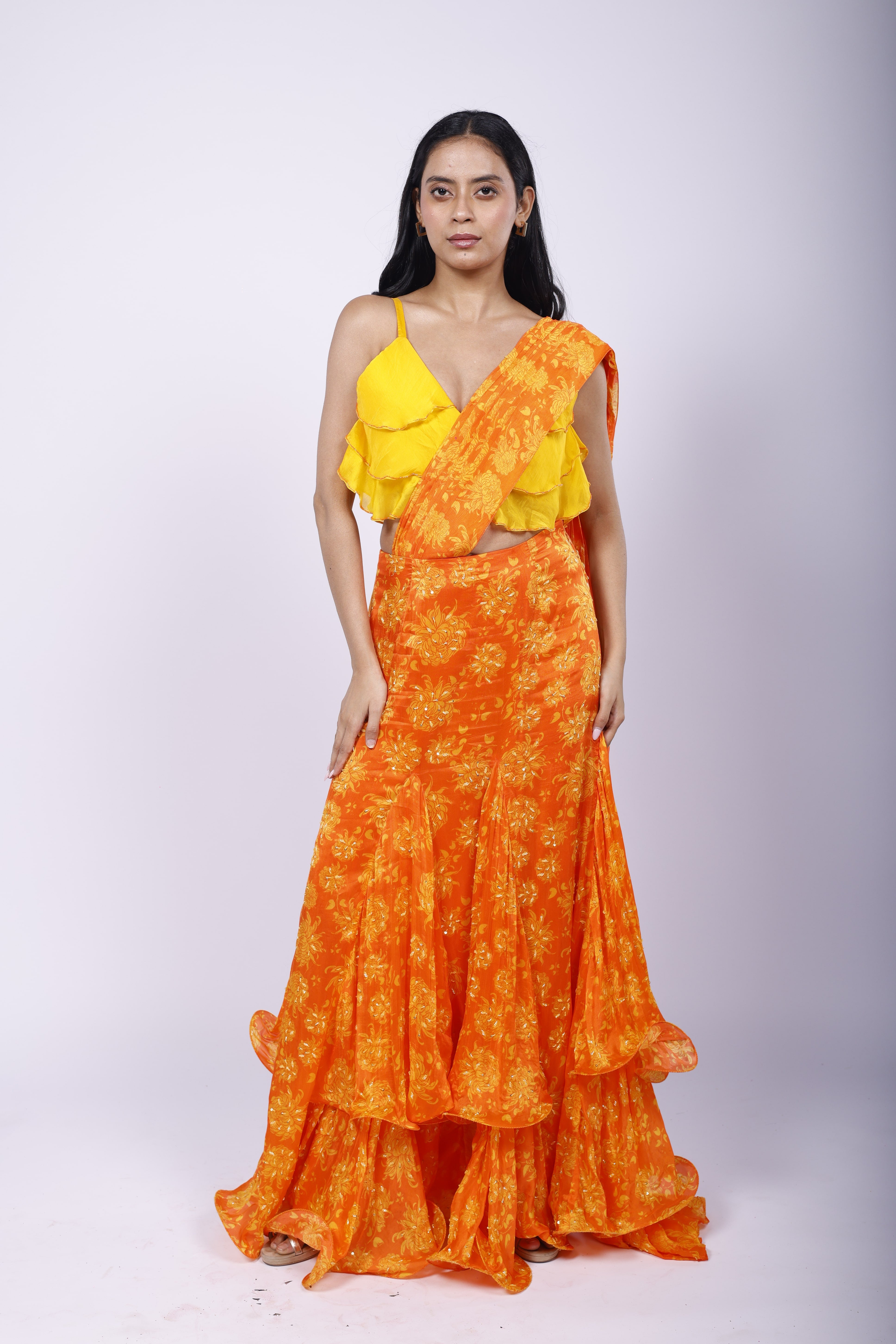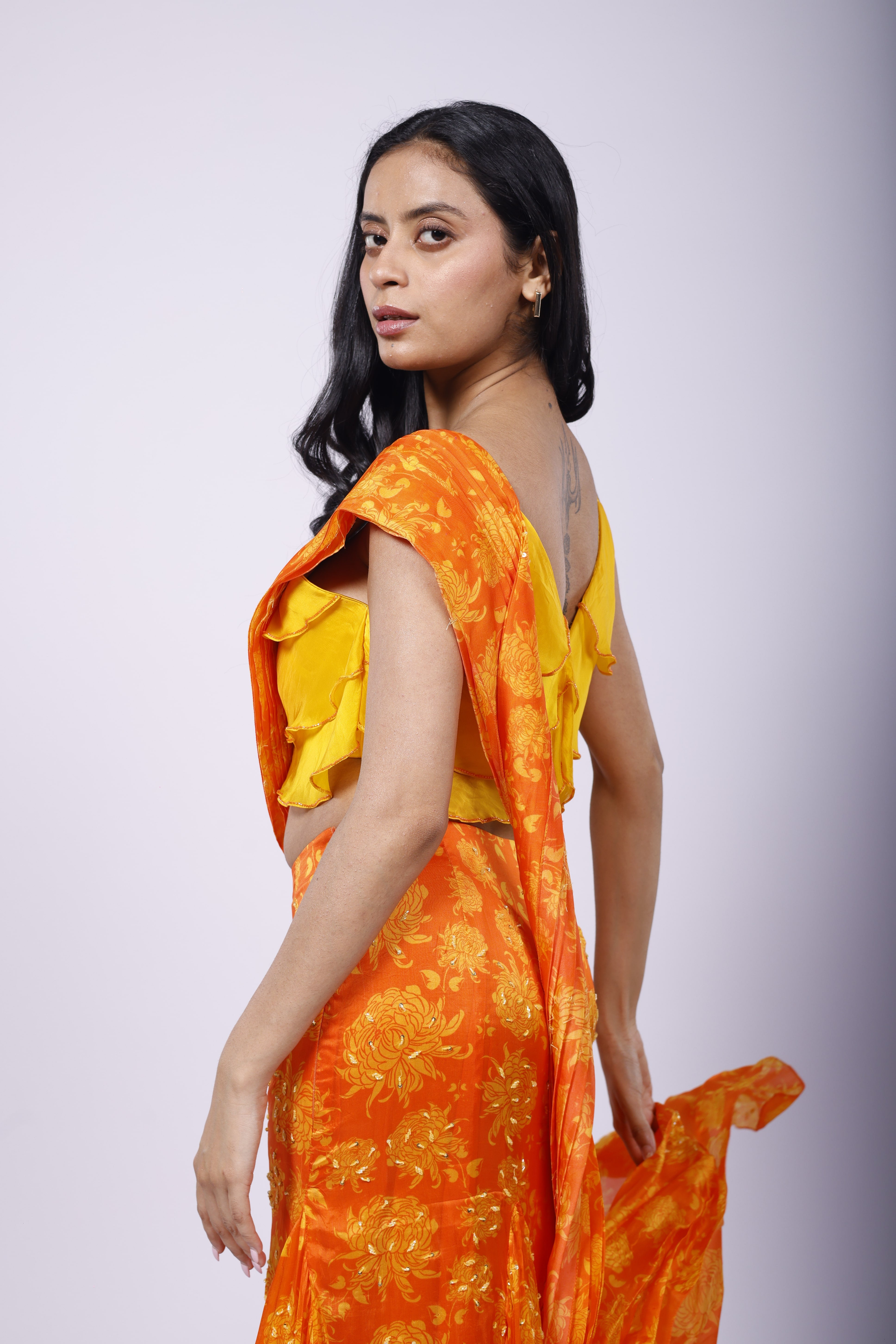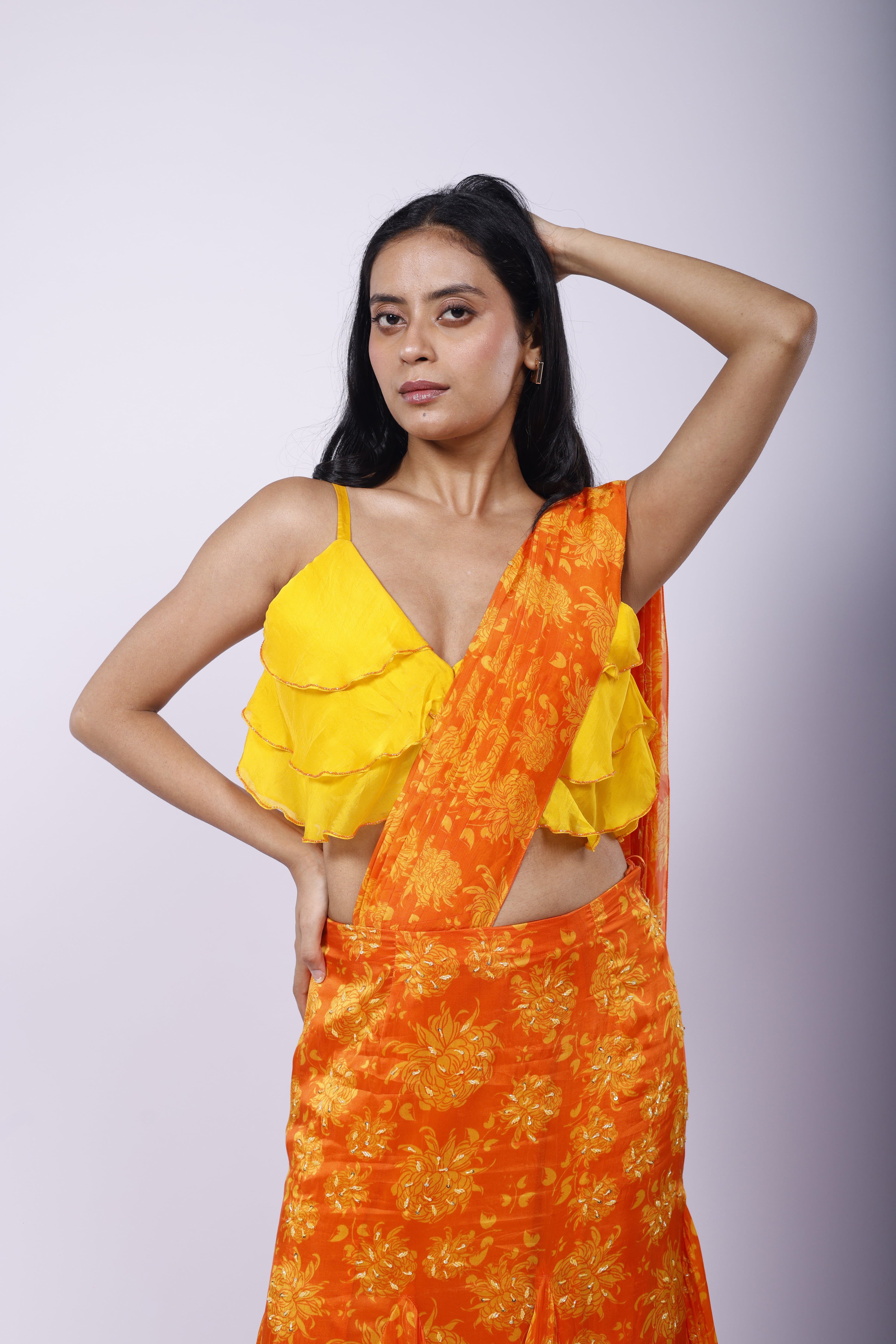 Featuring a marigold orange pre-draped saree in organza with cutdana and sequins hand embroidery. With Genda Fool print, it is paired with a sunflower yellow v-neck blouse. |