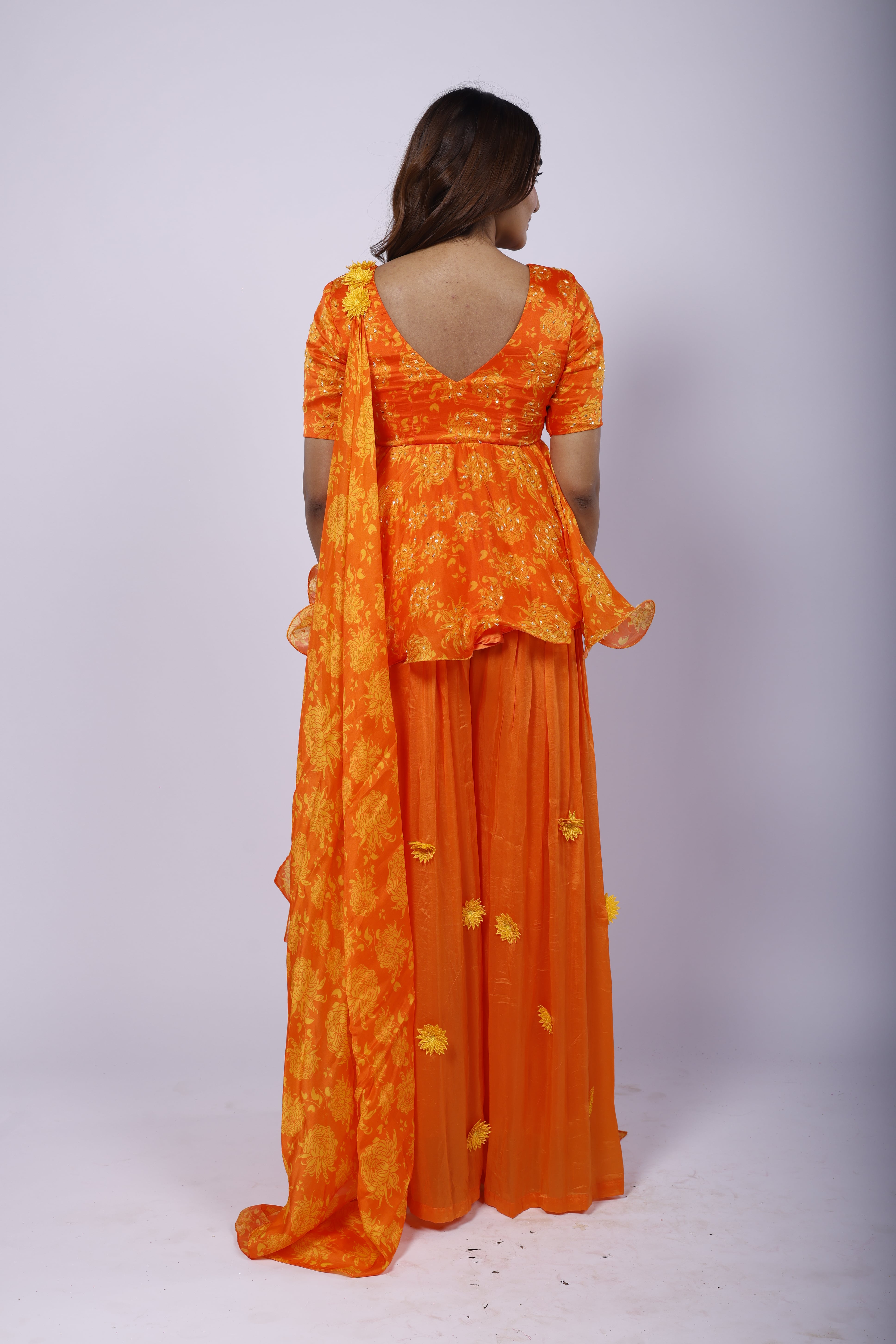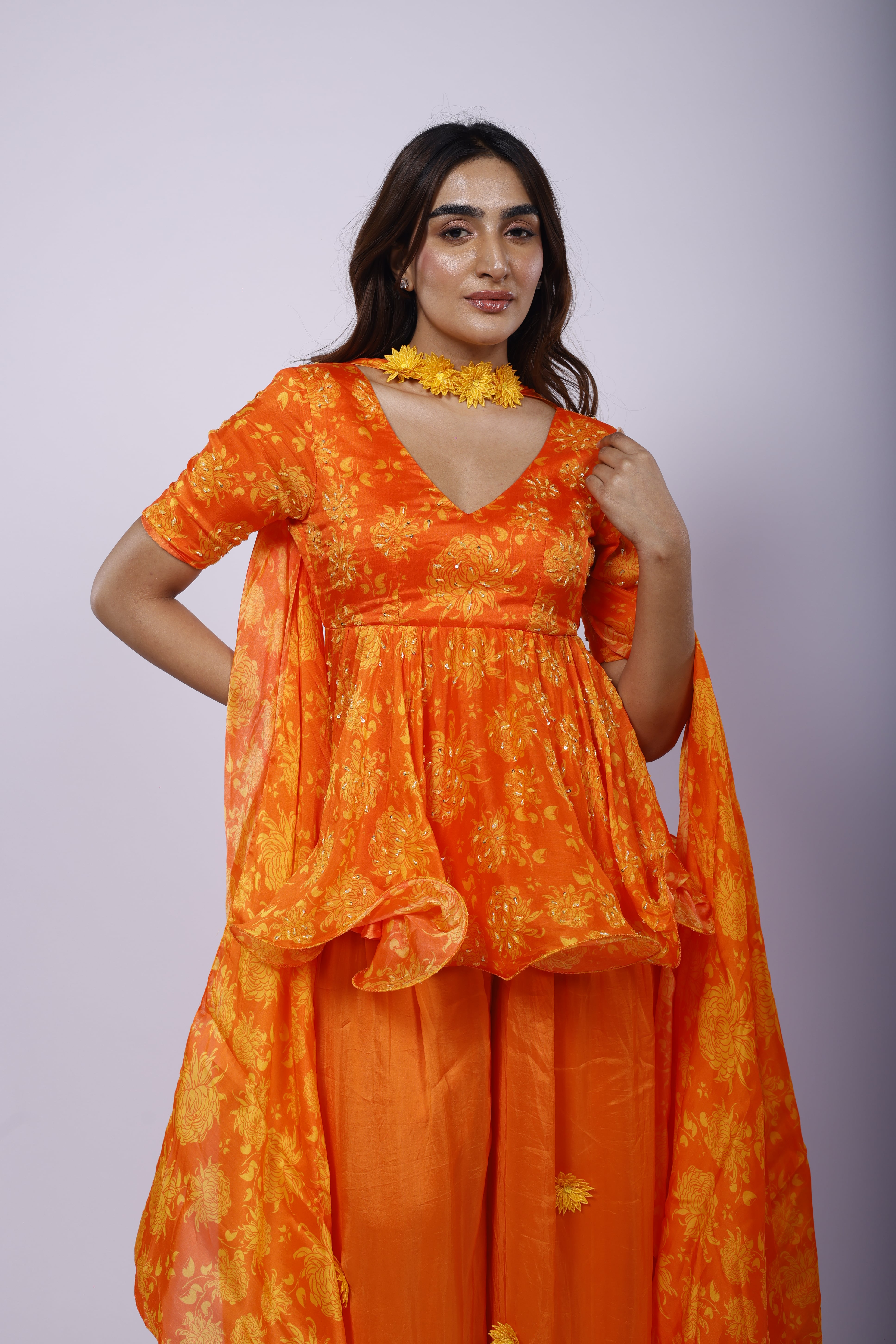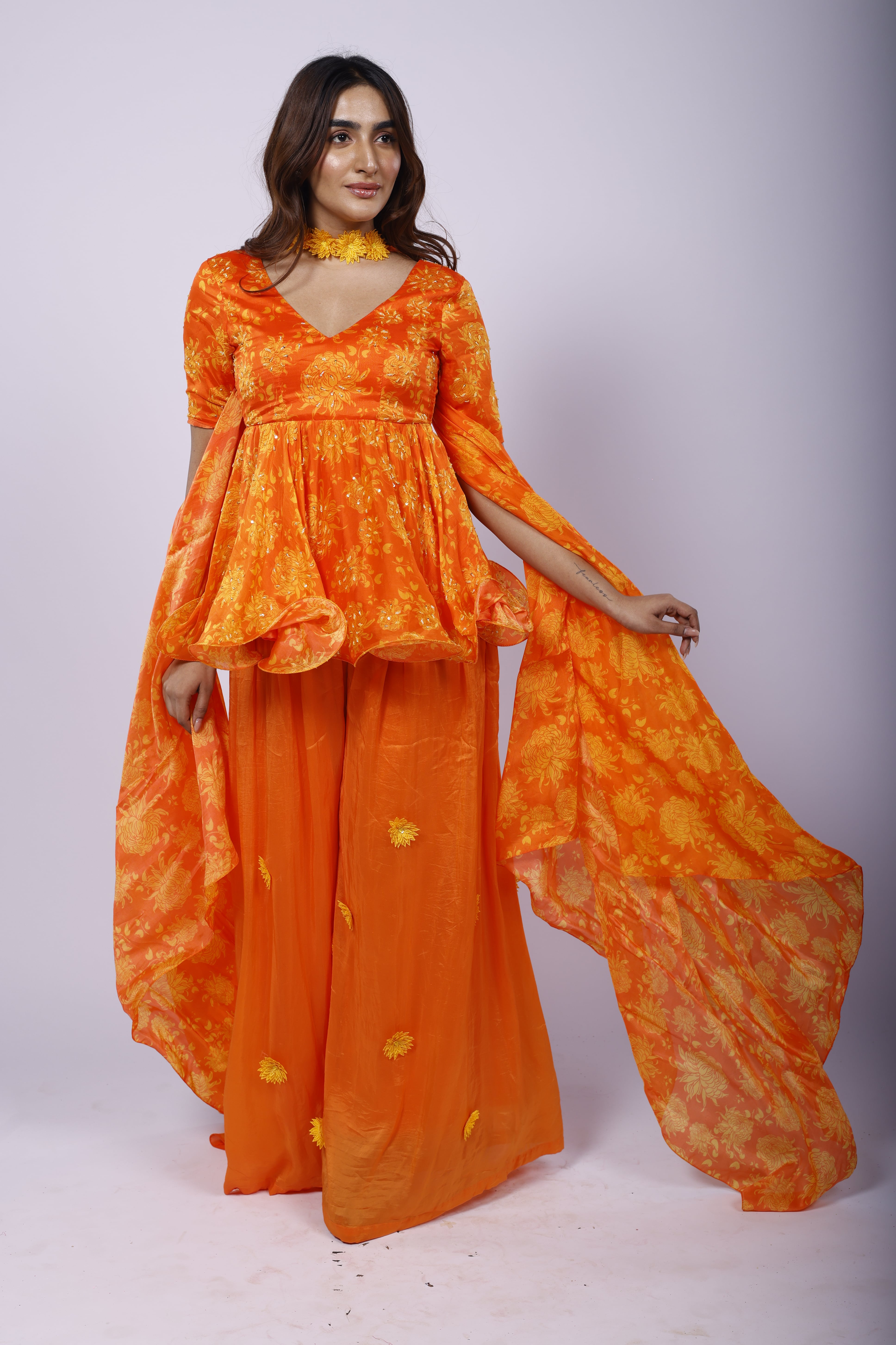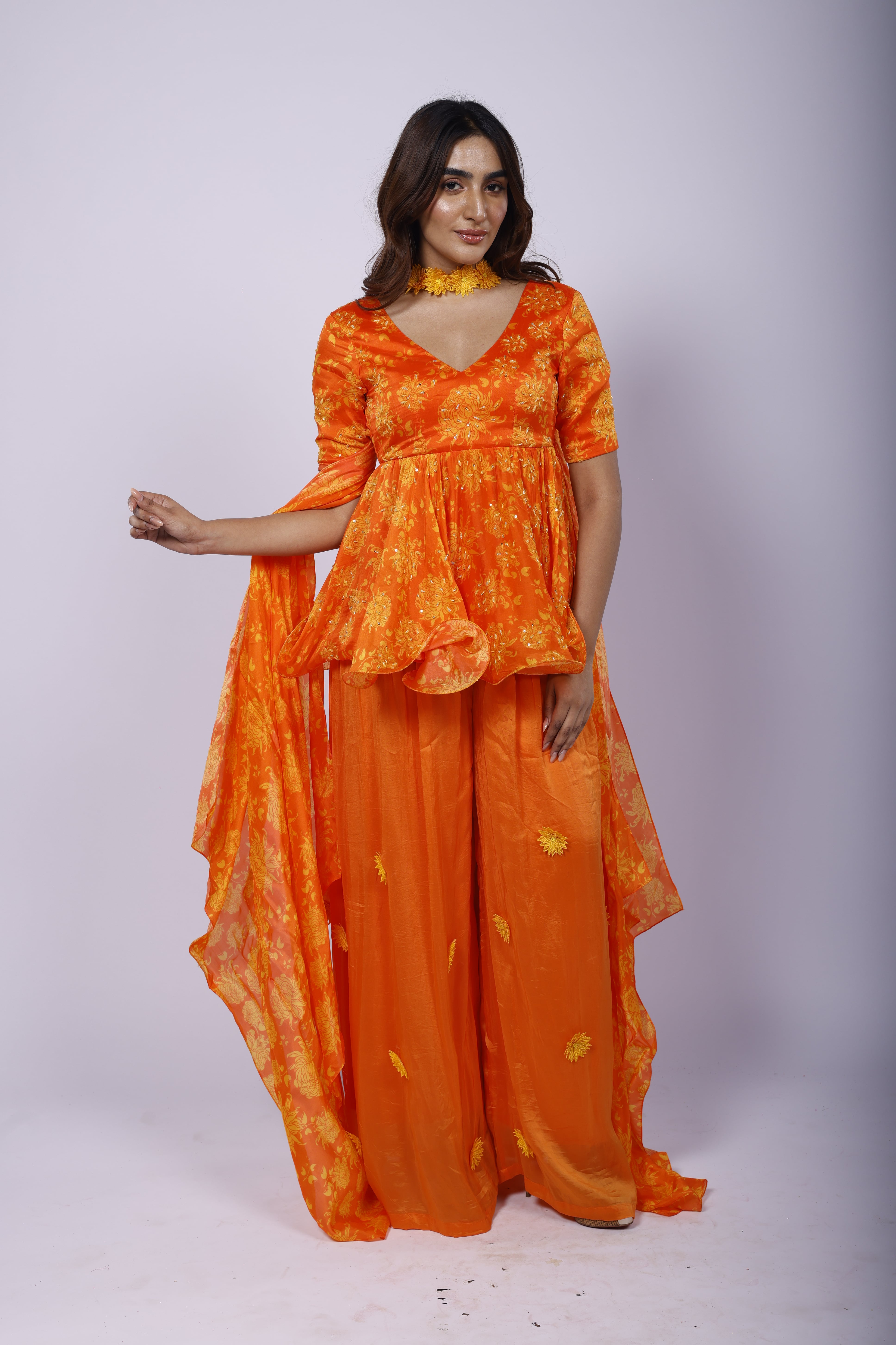 Featuring a marigold orange sharara set in organza with cutdana and sequins hand embroidery. With Genda Fool print, it is paired with a matching choker-dupatta and embellished with sunflower yellow 3D flowers. |