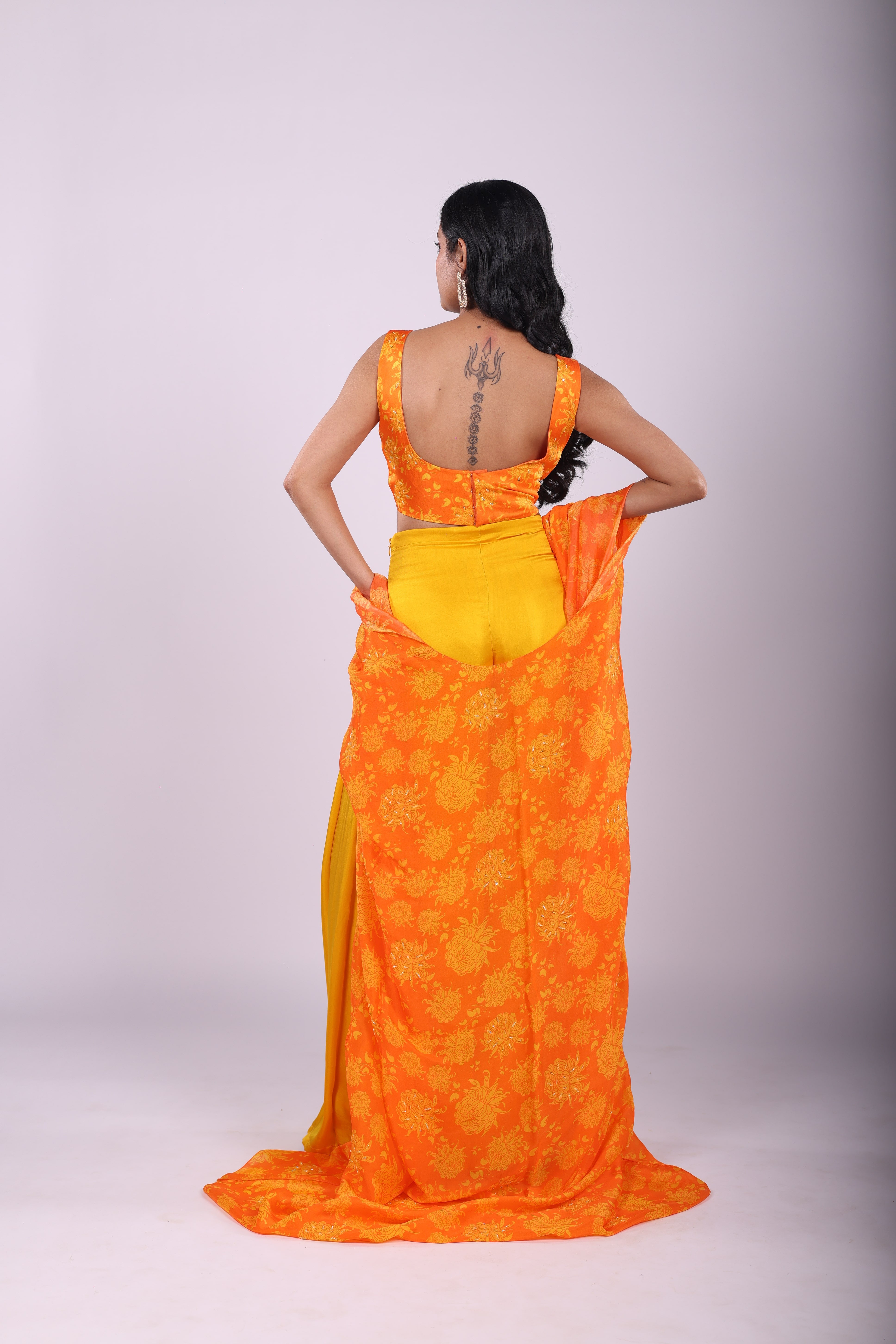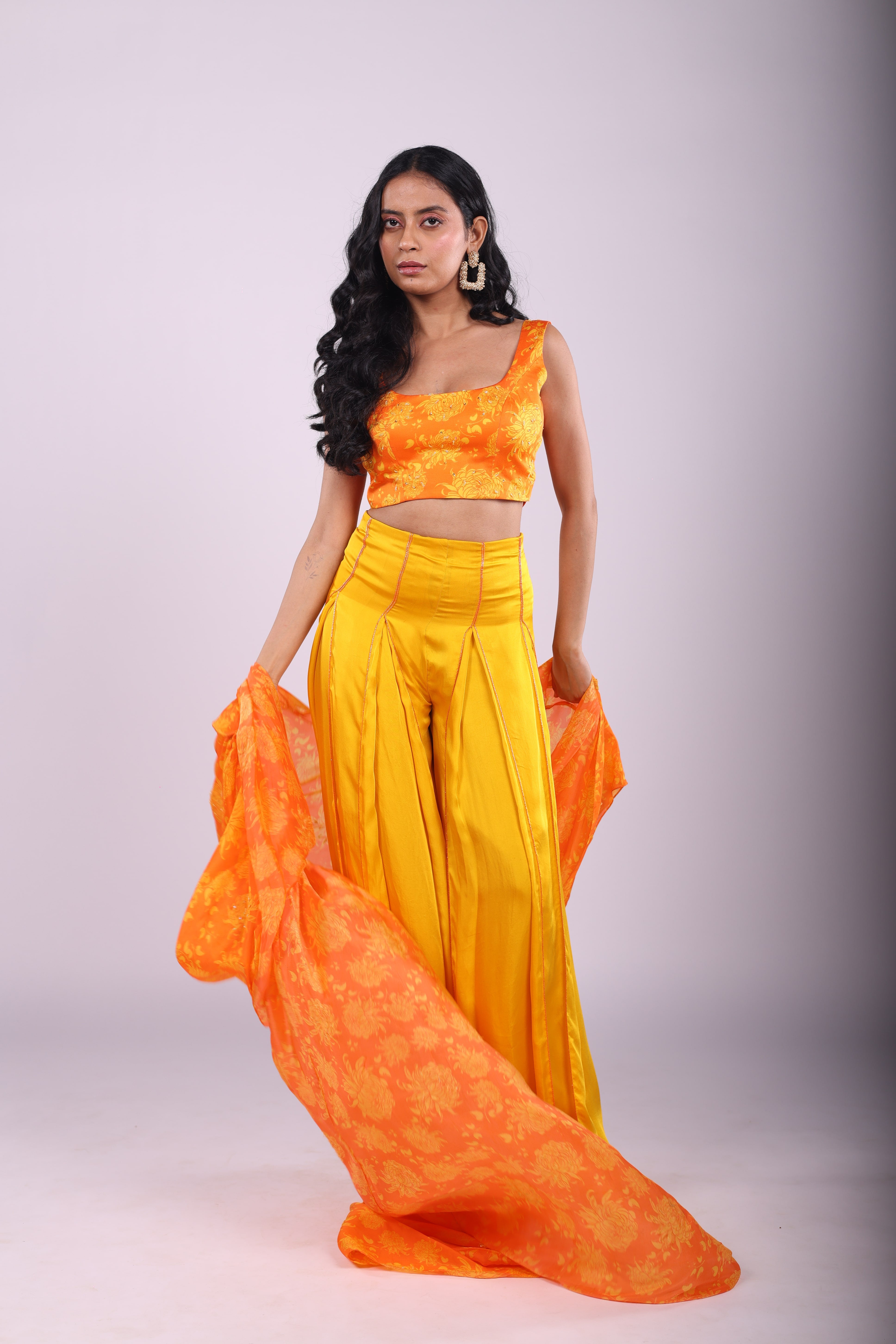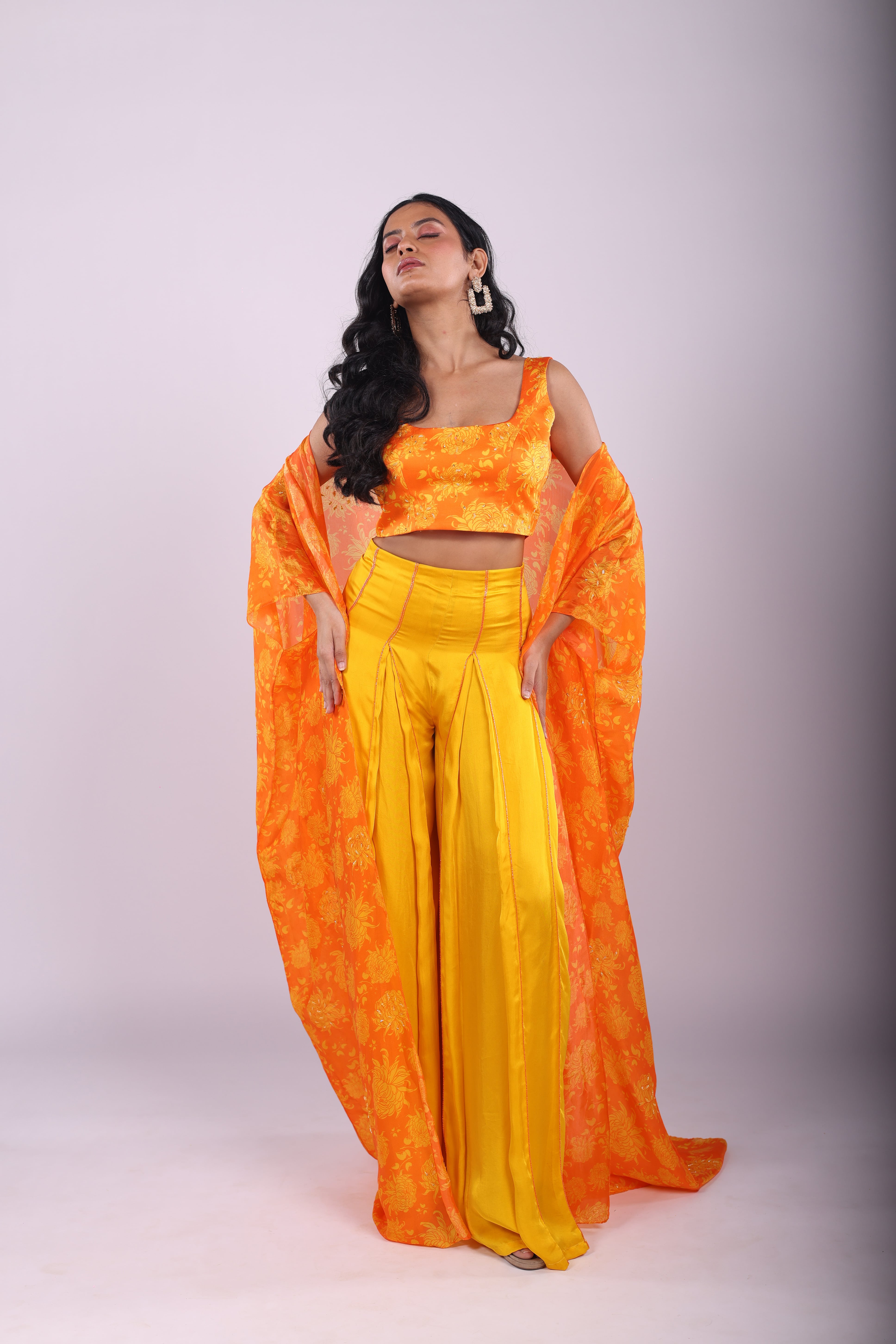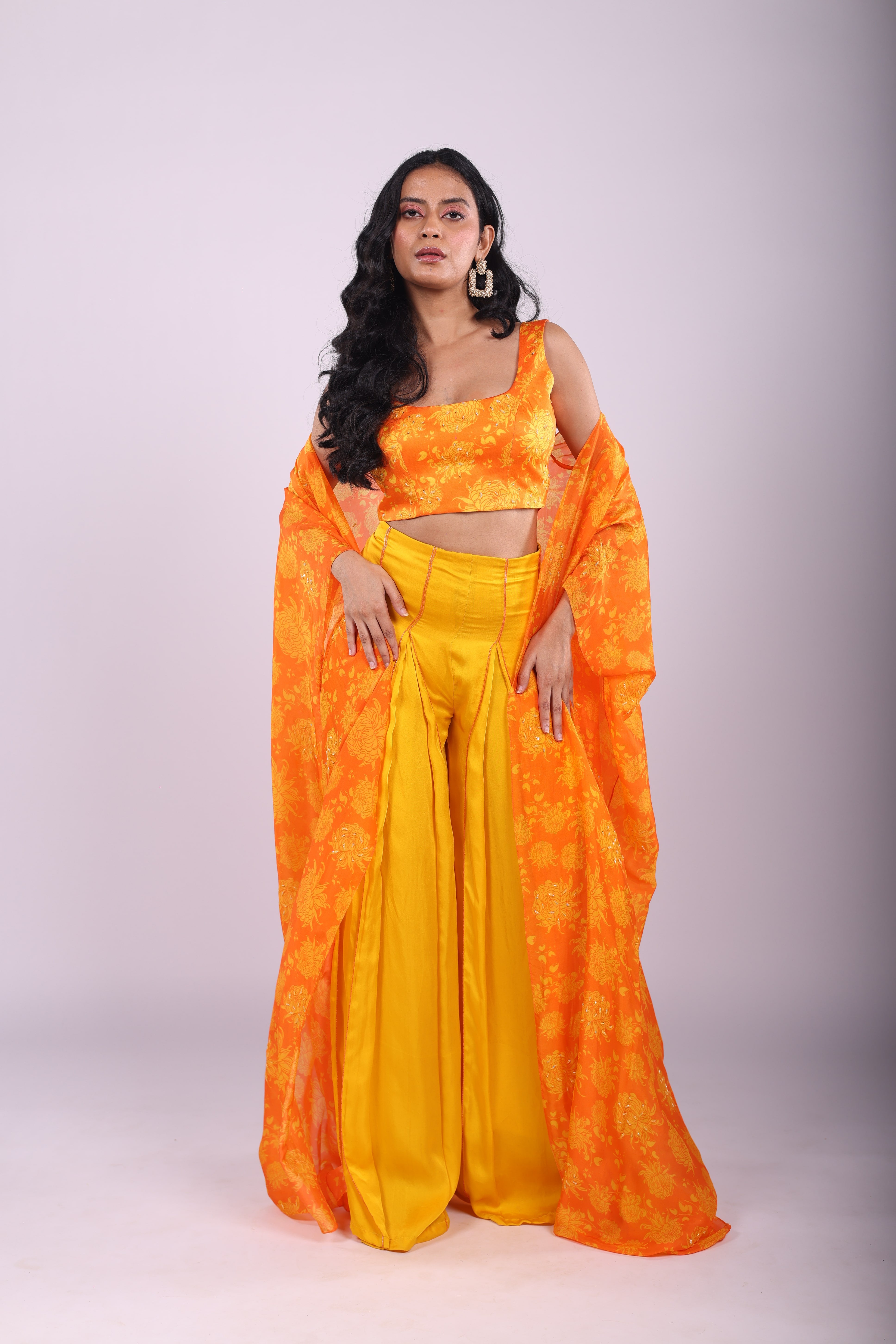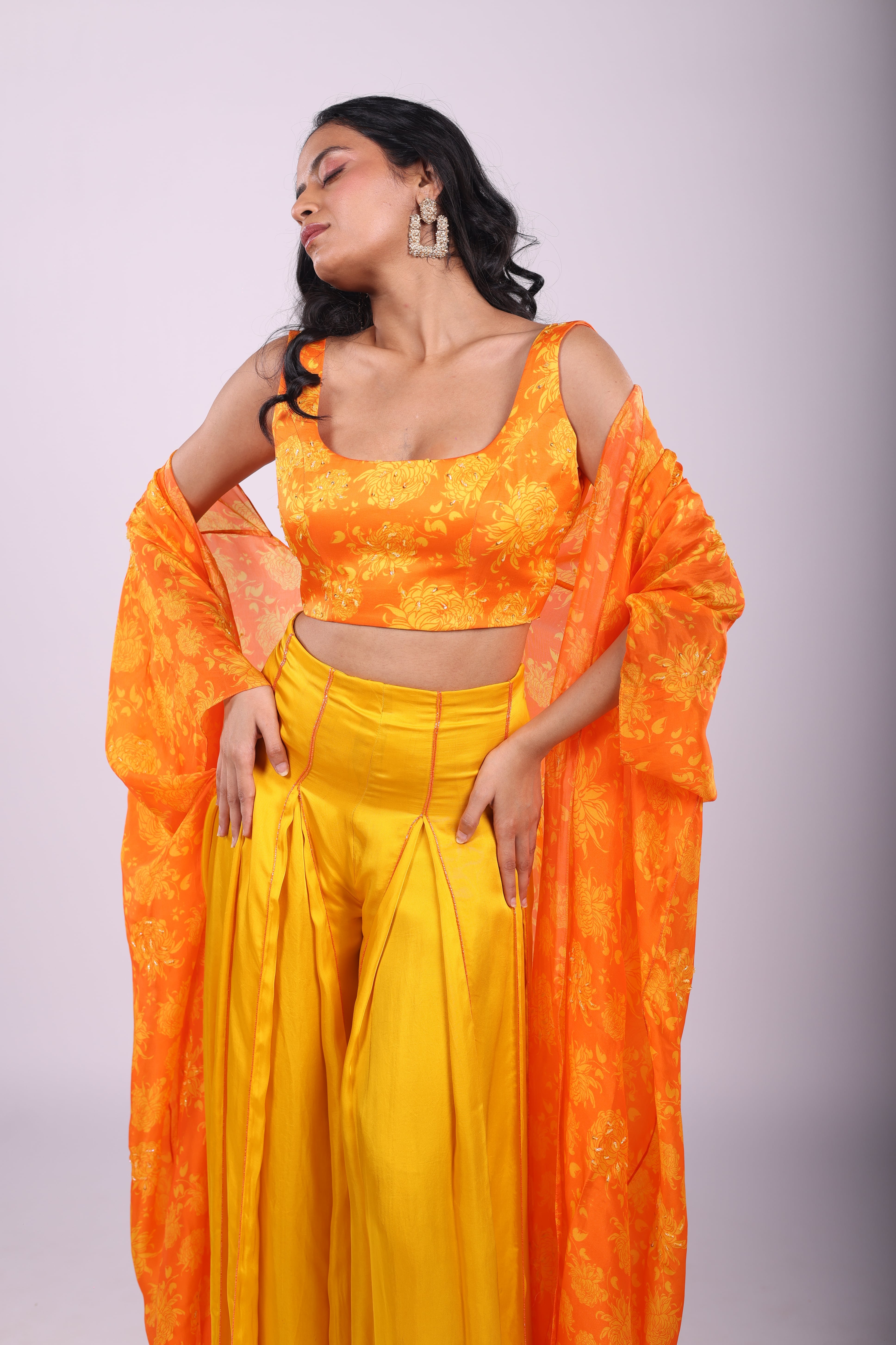 Featuring a sunflower yellow and marigold orange sharara set in satin base. Hand embroidered with sequins and cutdana, it is paired with Genda Fool printed cape and blouse. |