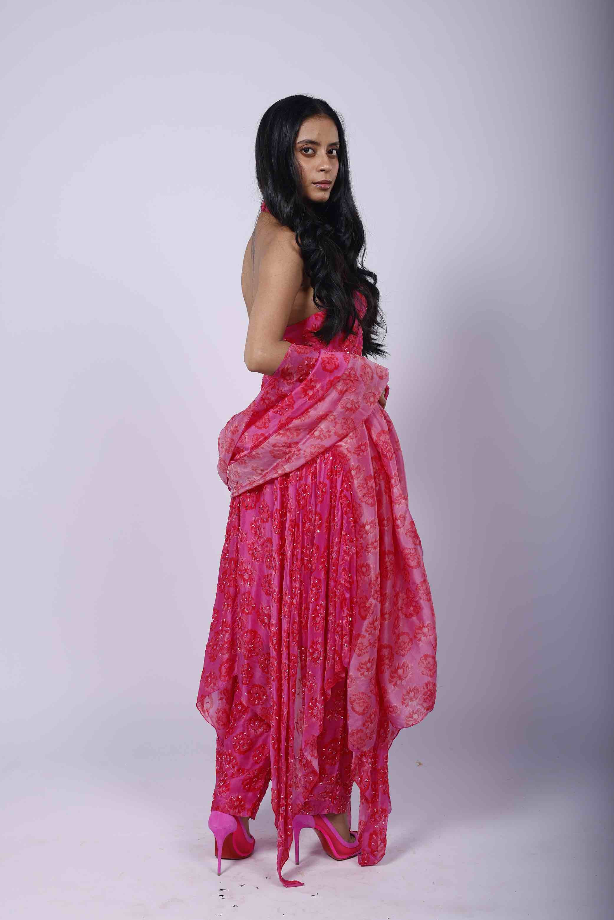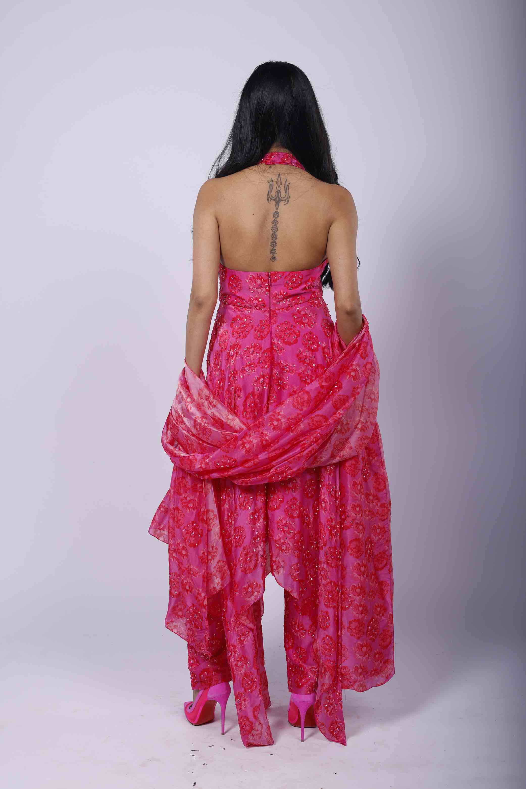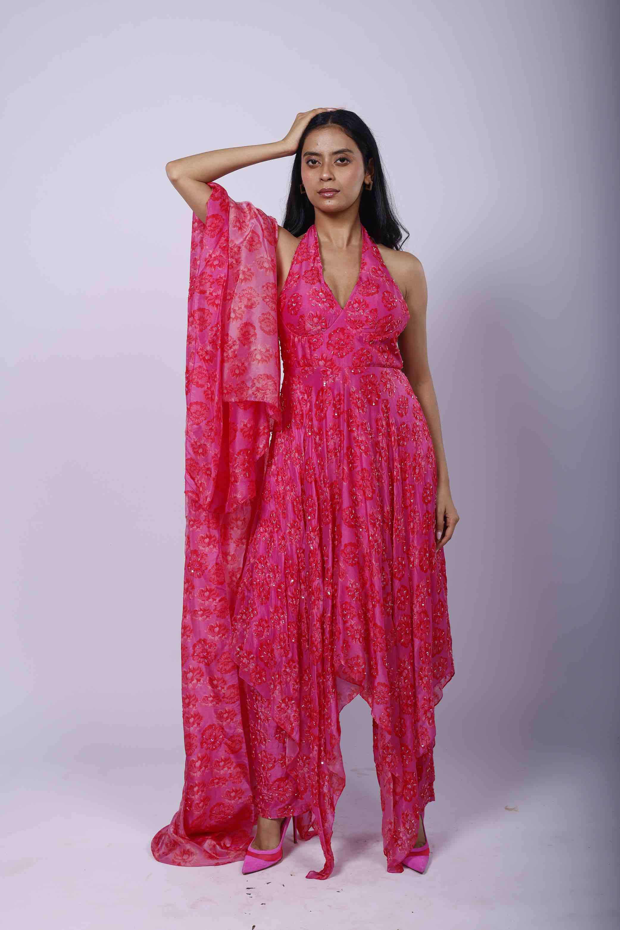 Featuring a cosmos purple and peony pink anarkali set in organza with Kamal Kitsch print.Hand embroidered with cutdana and sequins, it is paired with a matching dupatta. |