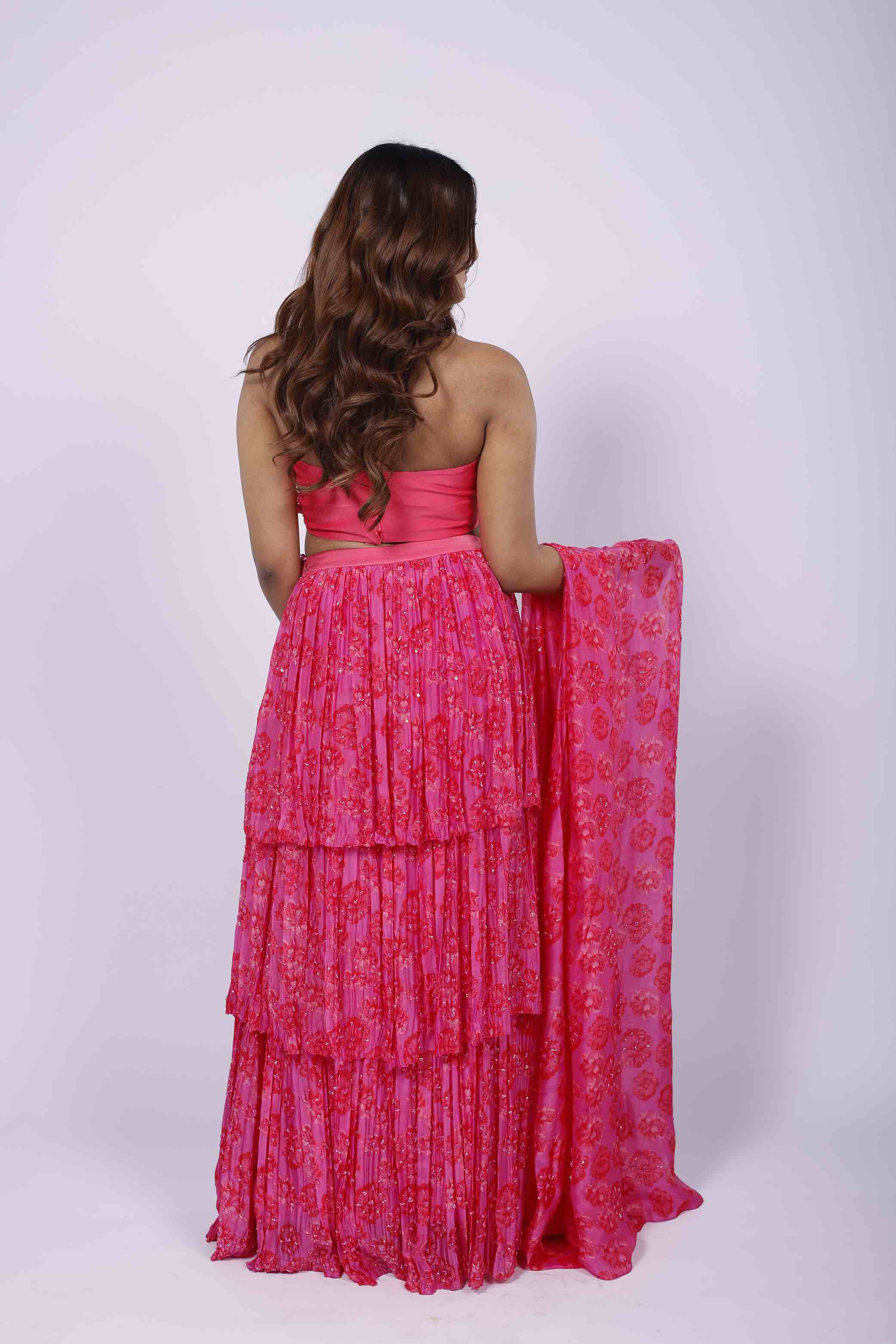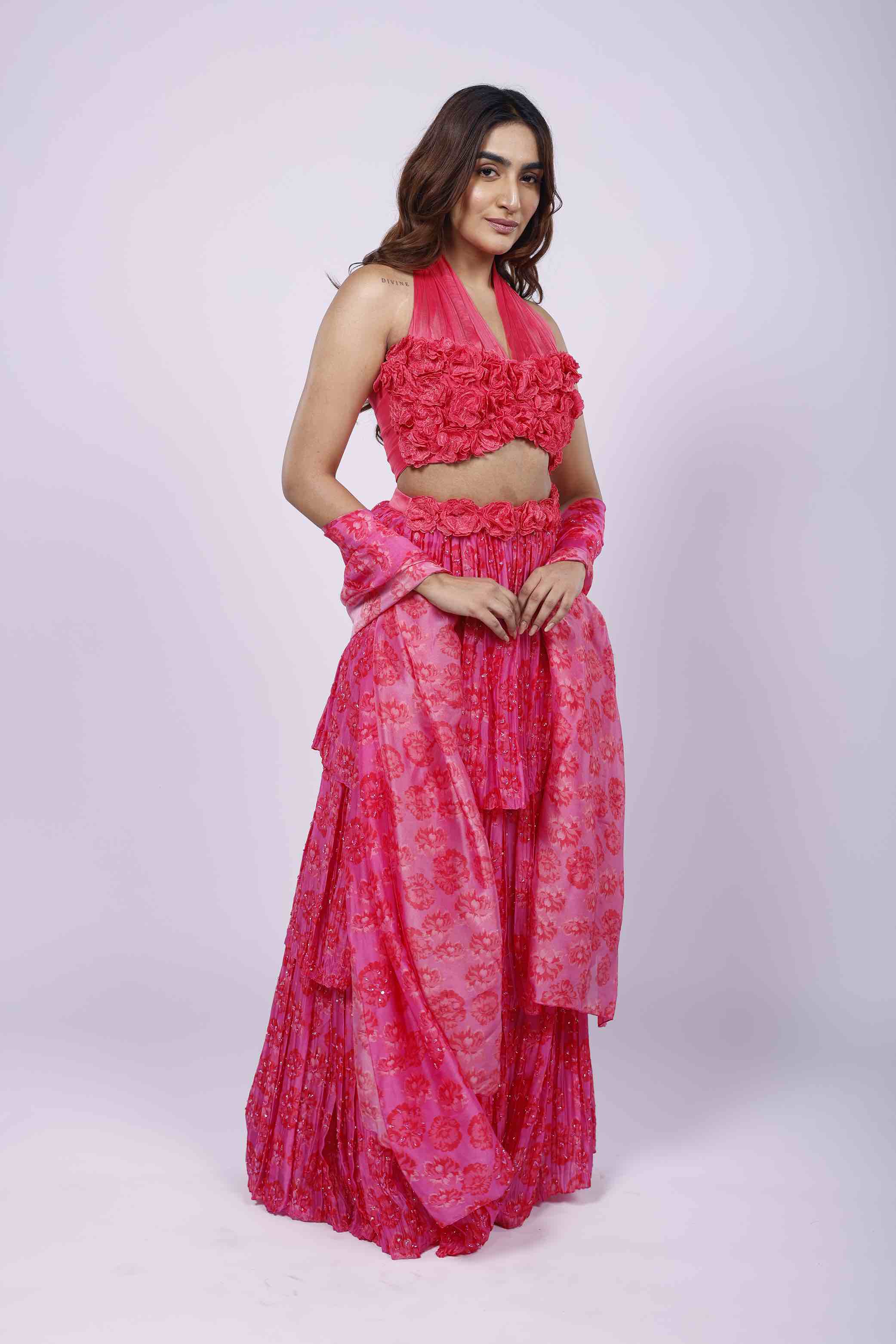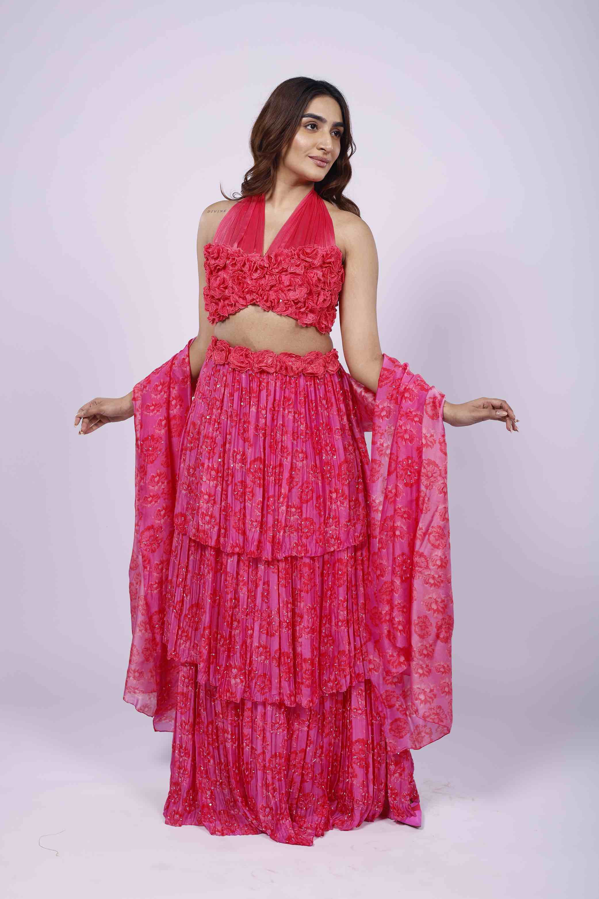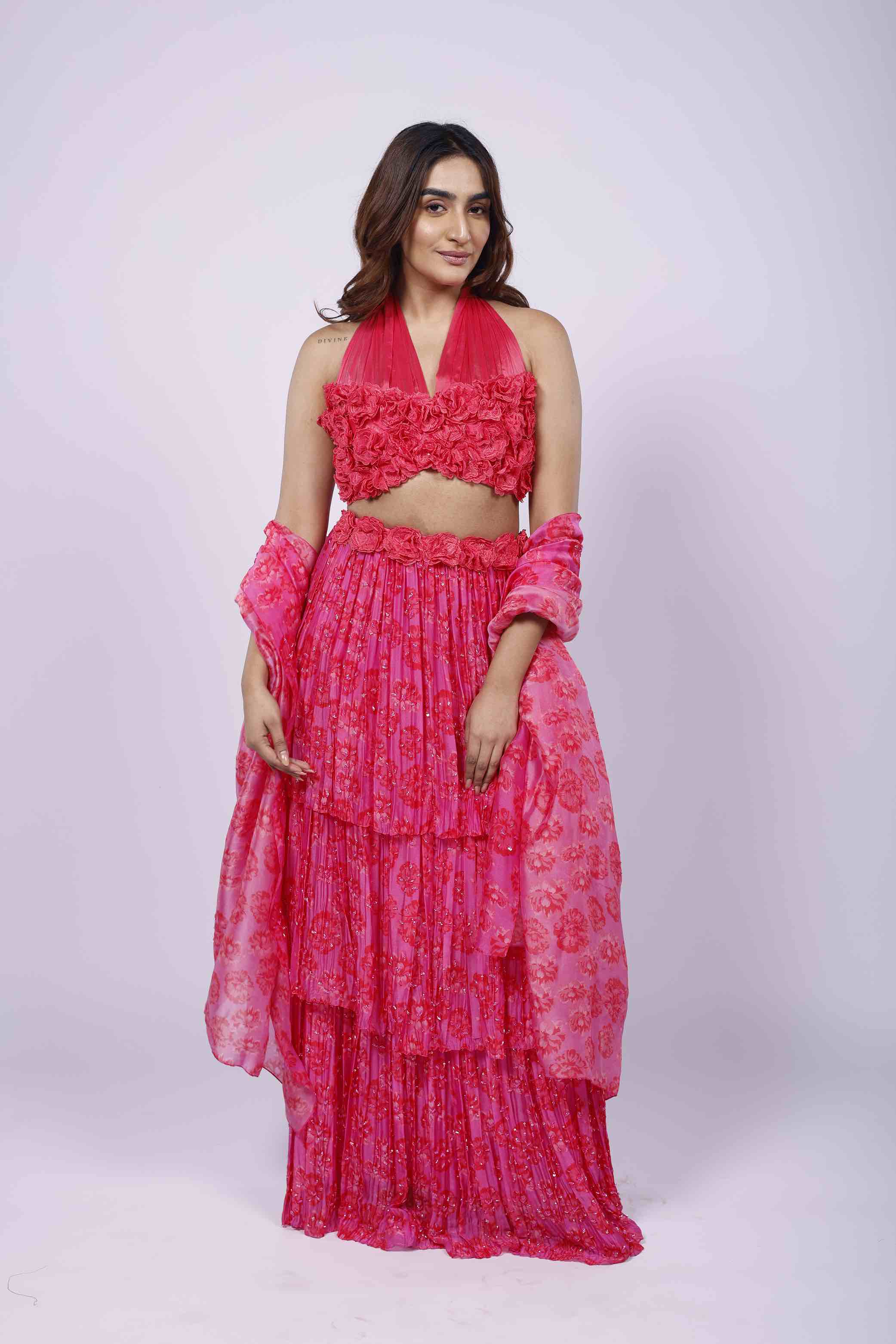 Featuring a cosmos purple and peony pink lehenga set in organza with Kamal Kitsch print. It is paired with a matching dupatta, hand embroidered with cutdana and sequins and embellished with 3D flowers. |