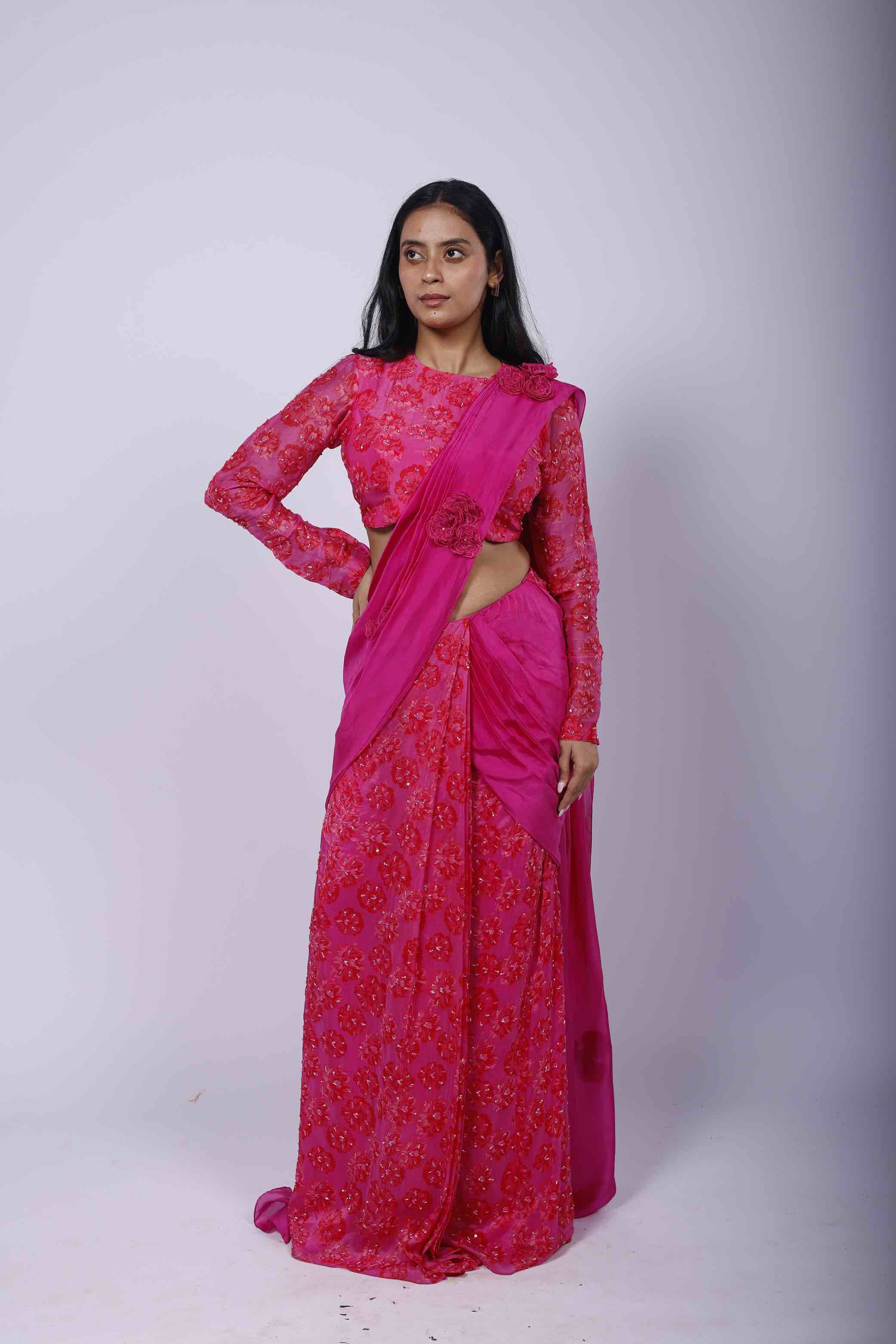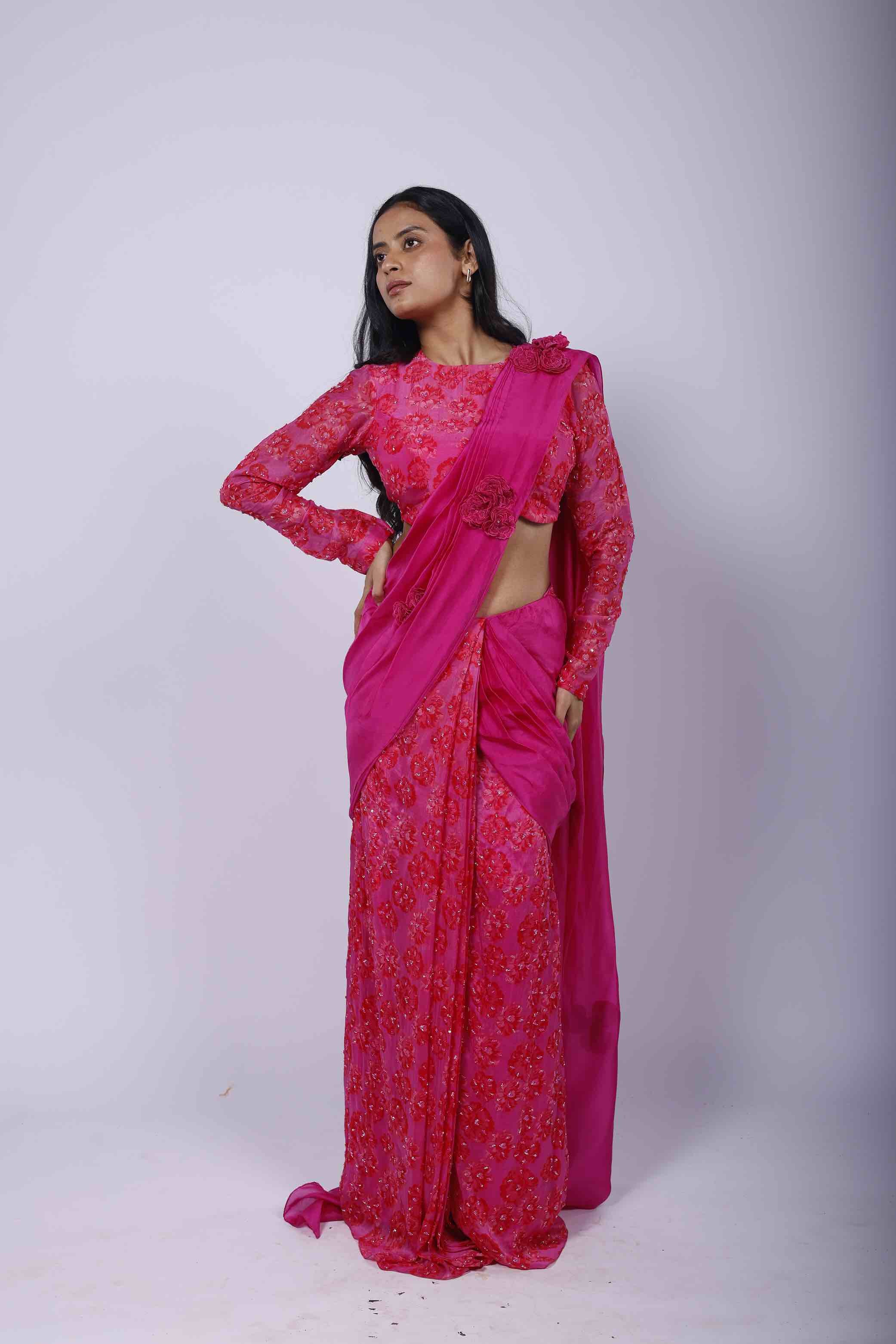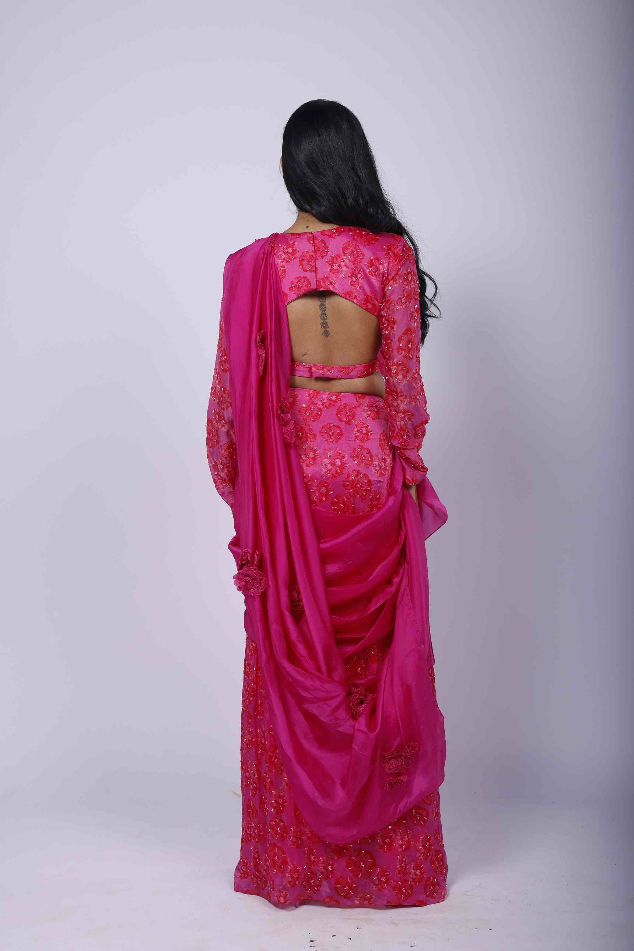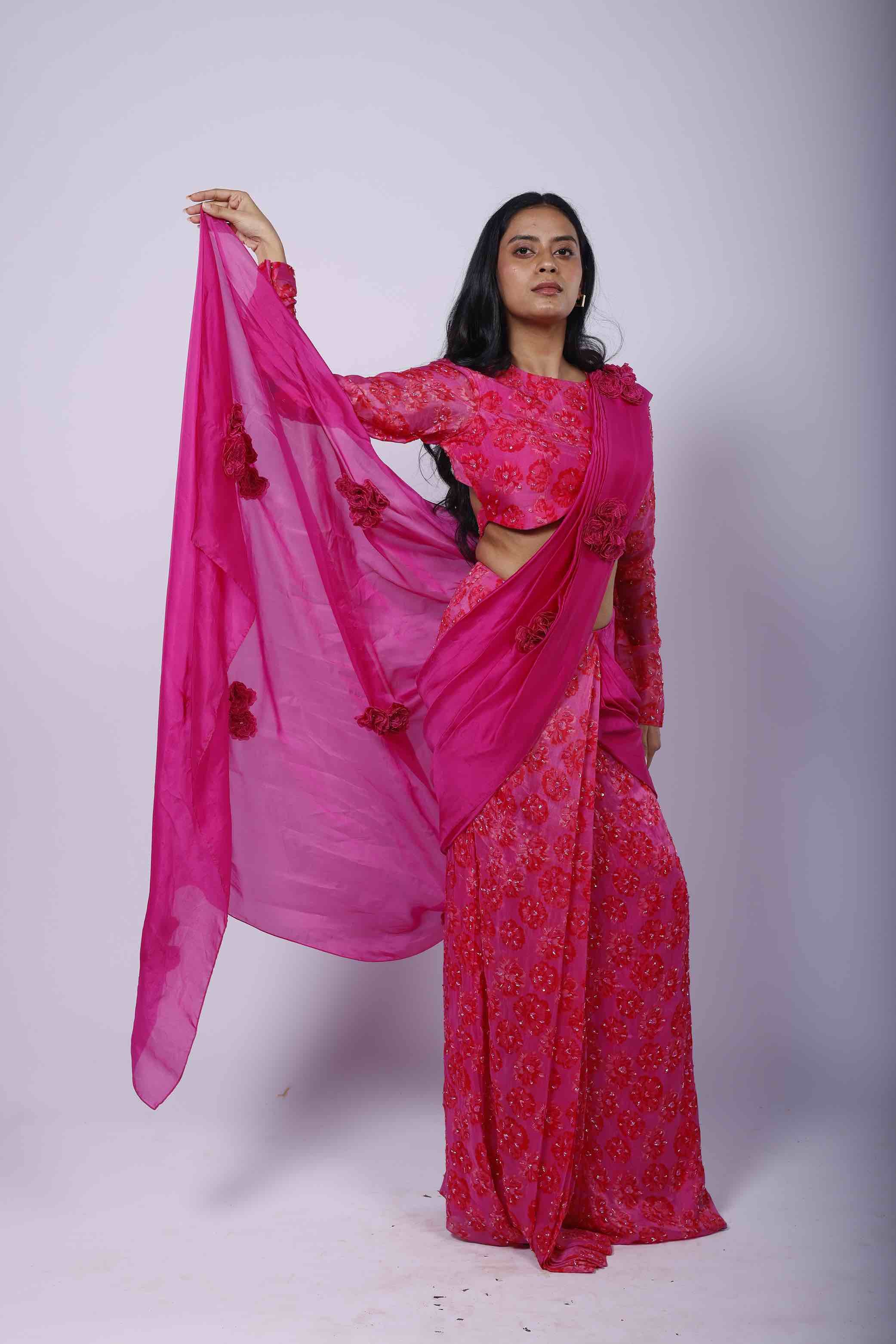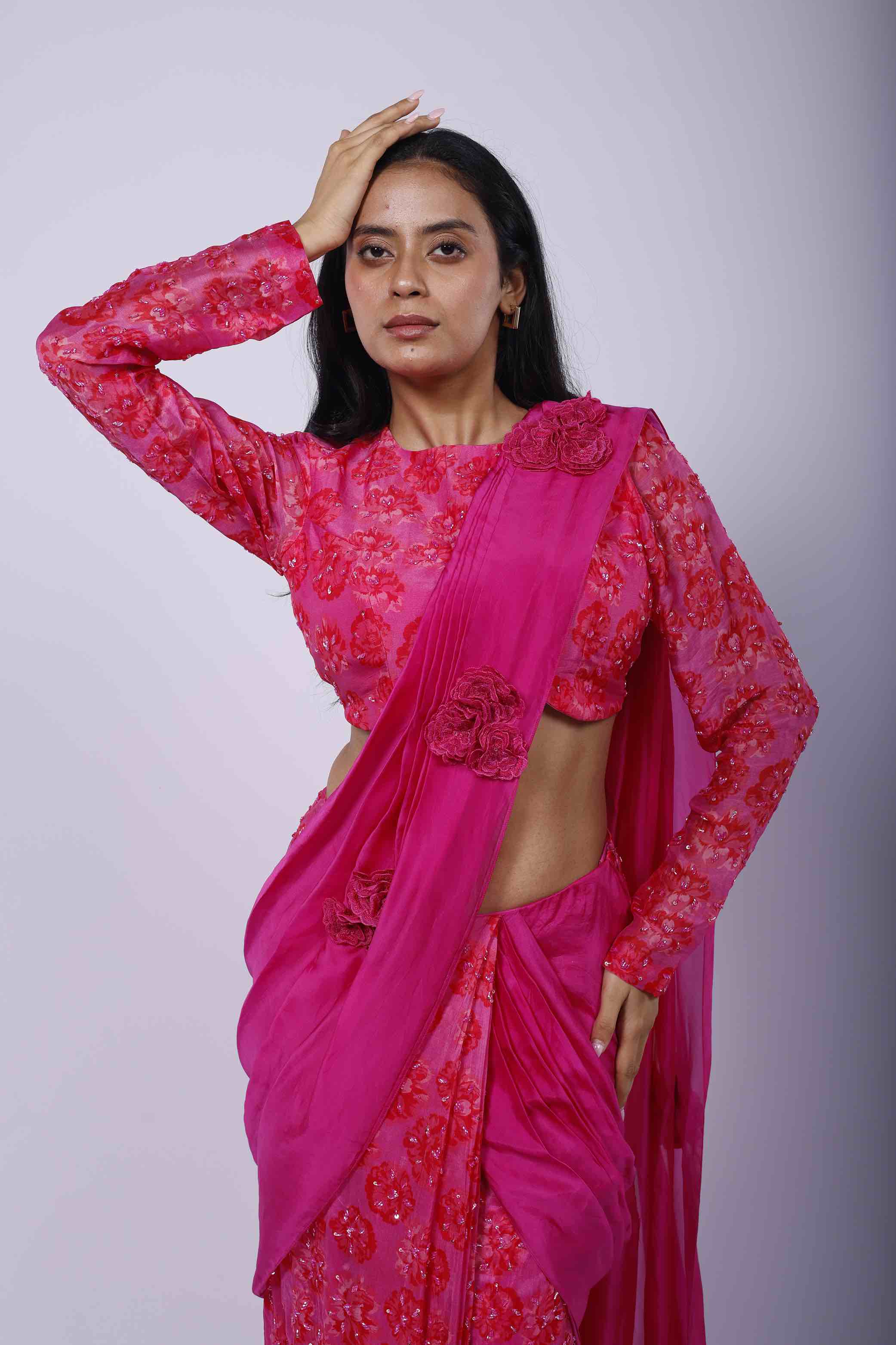 Featuring a cosmos purple and peony pink organza pre-draped saree set with Kamal Kitsch print. Hand embroidered with cutdana and sequins, it is embellished with 3D flowers. |