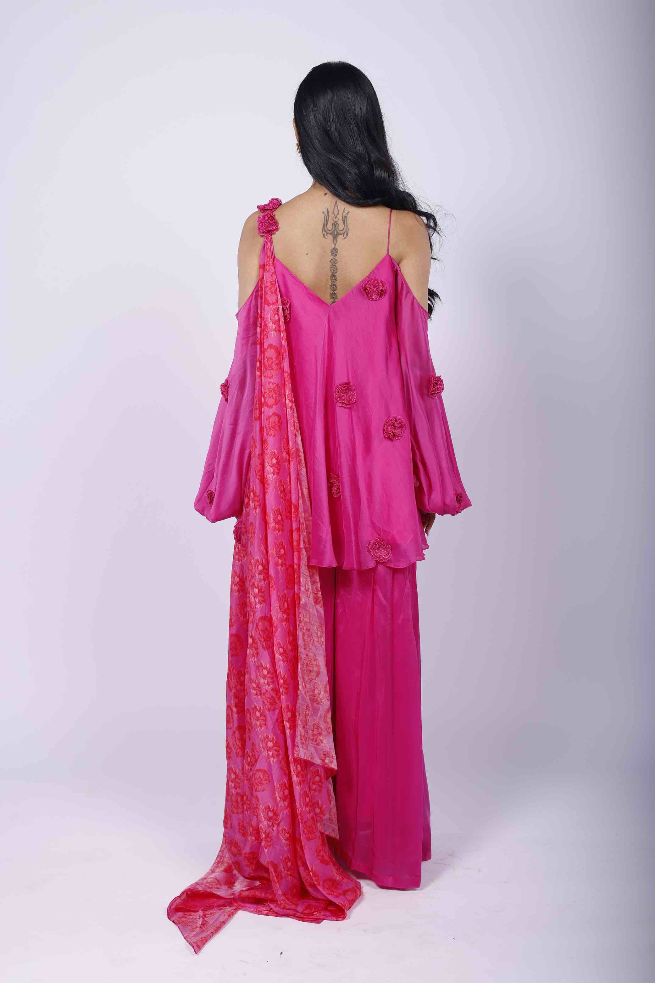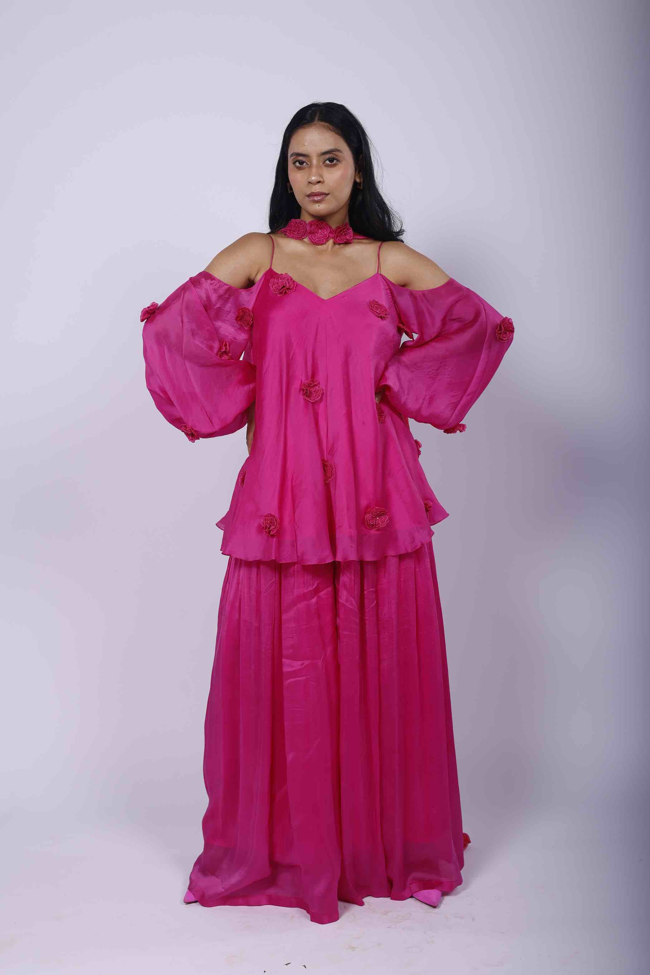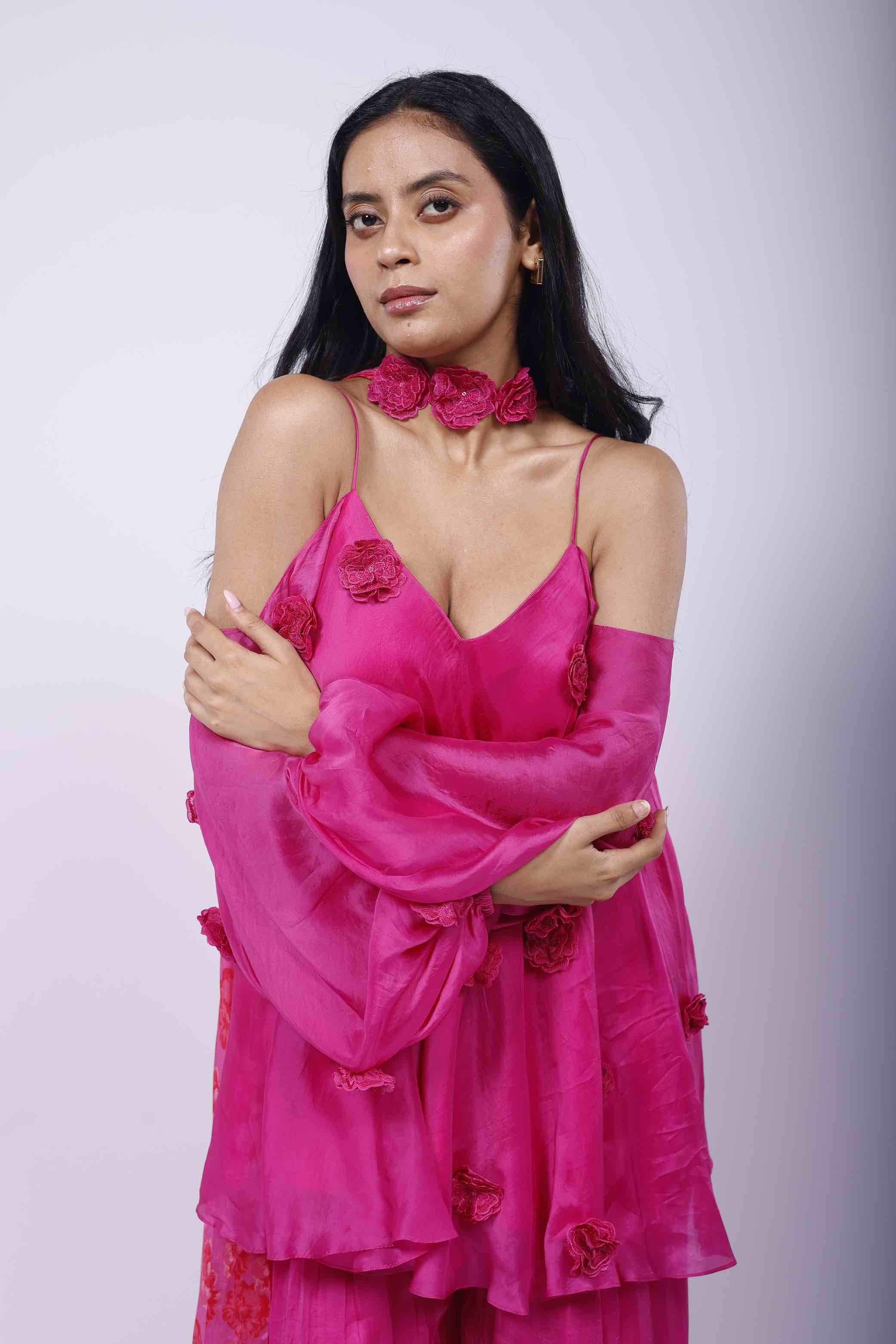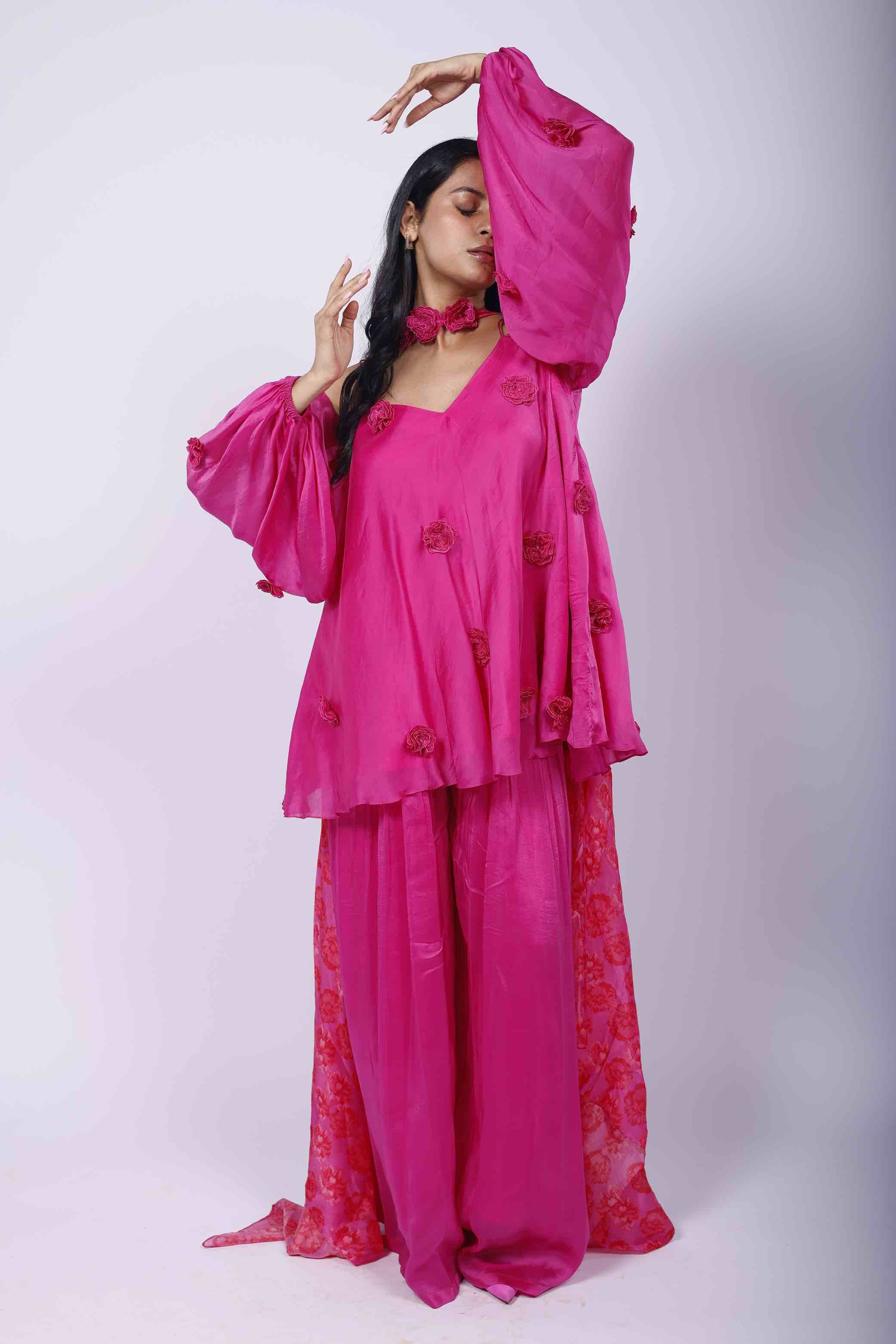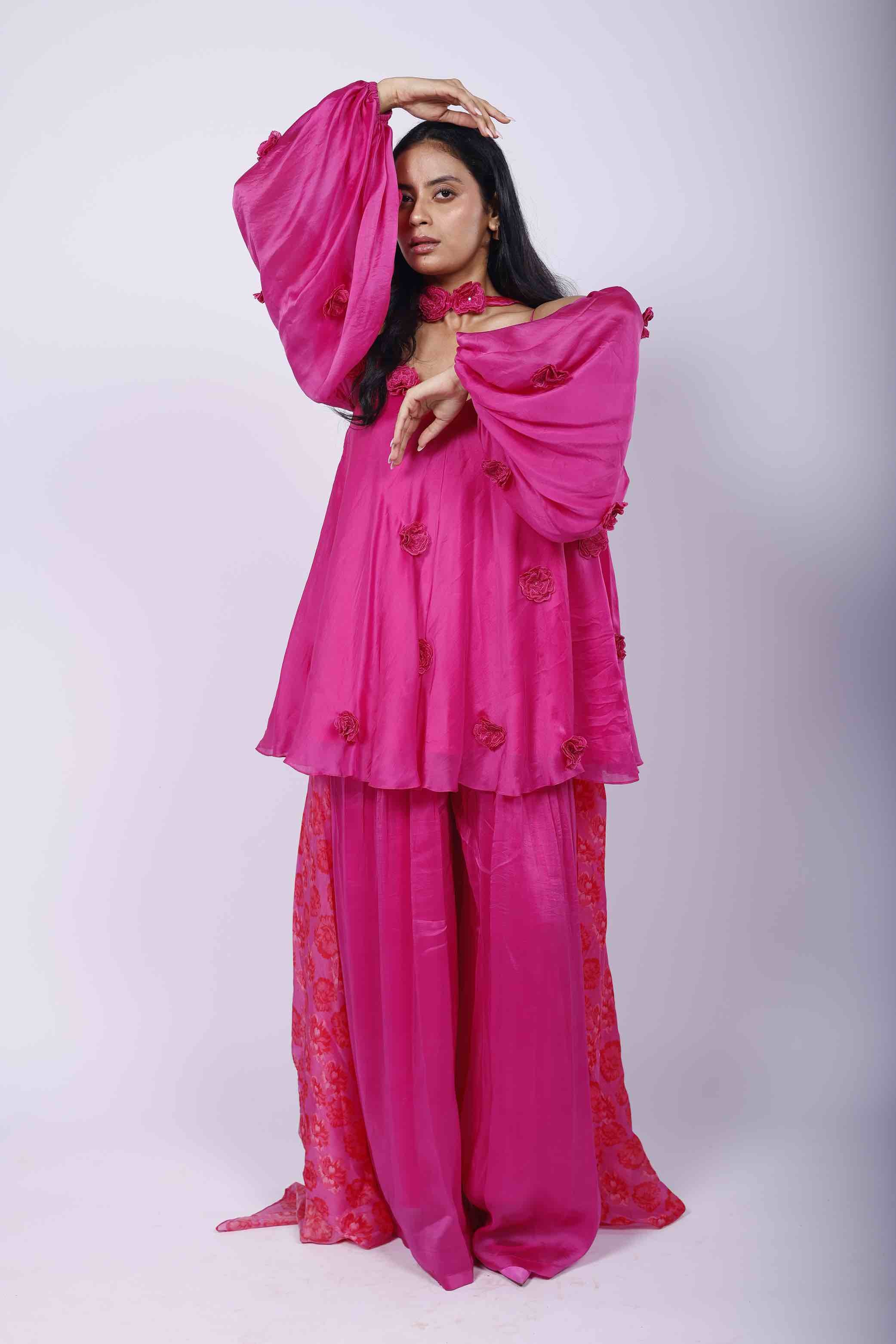 Featuring a cosmos purple sharara set in organza, embellished with 3D flowers. It is paired with a Kamal Kitsch print choker-dupatta. |