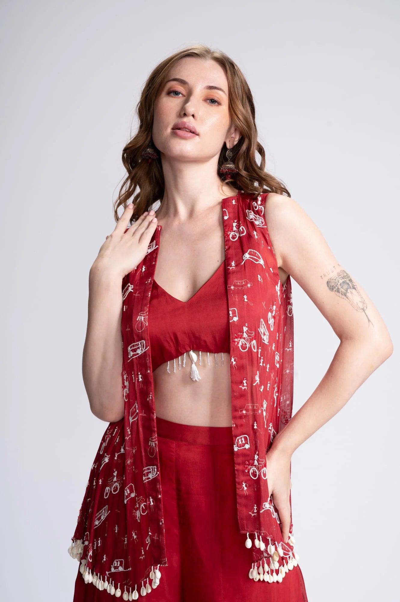 | Featuirng a tabby silk three piece sharara set in vivid burgundy. Embellished with kaudi it is paired with a warli printed jacket and deep v neckline blouse. |