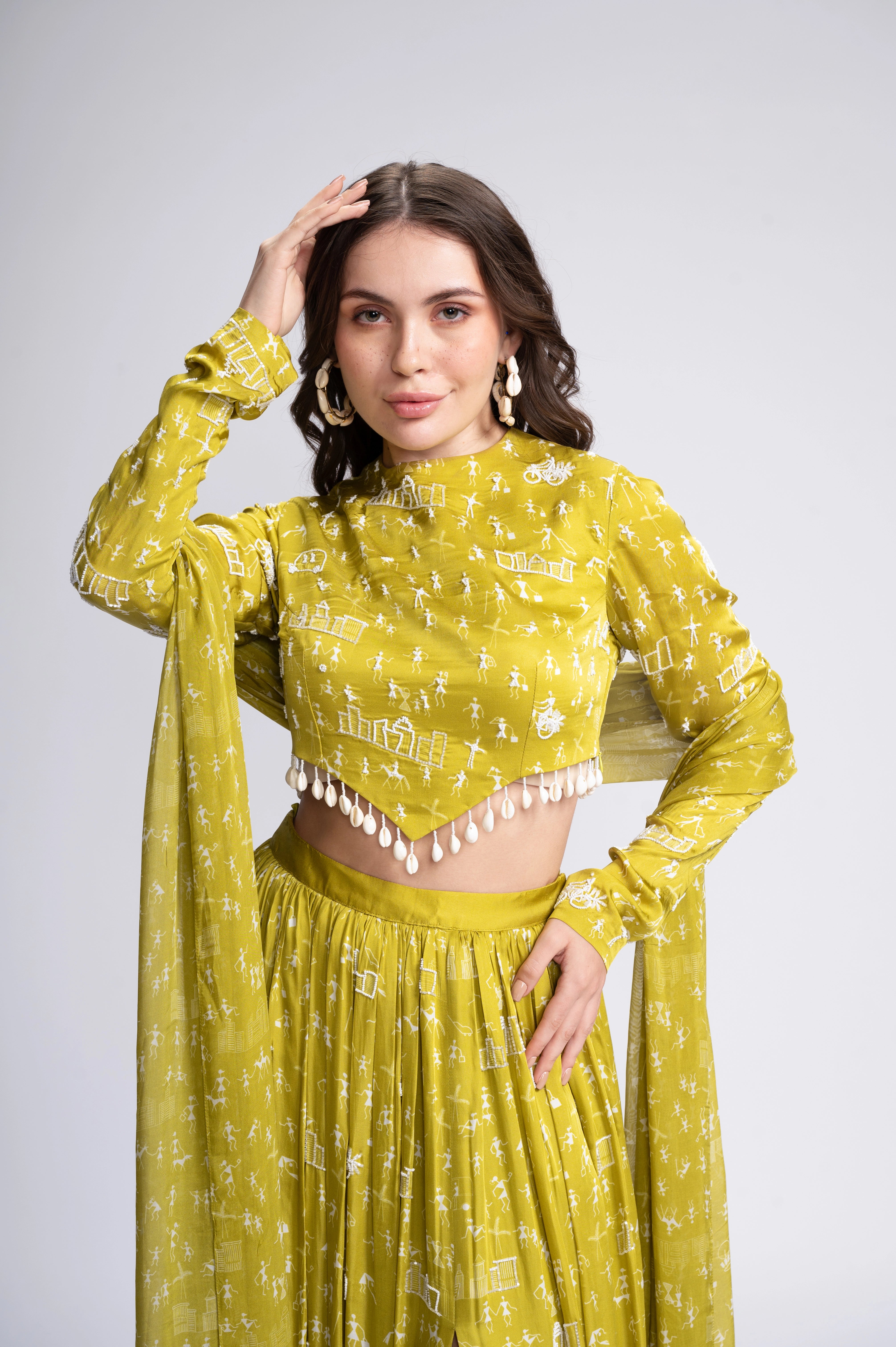 | Featuring a mustard green lehenga set in satin base with sequins, beads and cutdana hand embroidery. With warli art printed digitally it is embellished with kaudi and tassles. It is paired with a matching crew neck blouse and a tabby silk dupatta. |