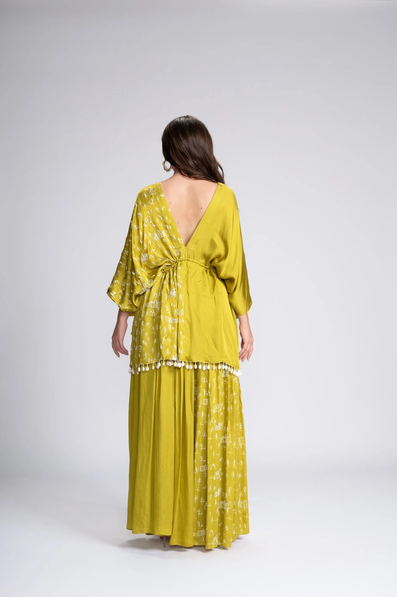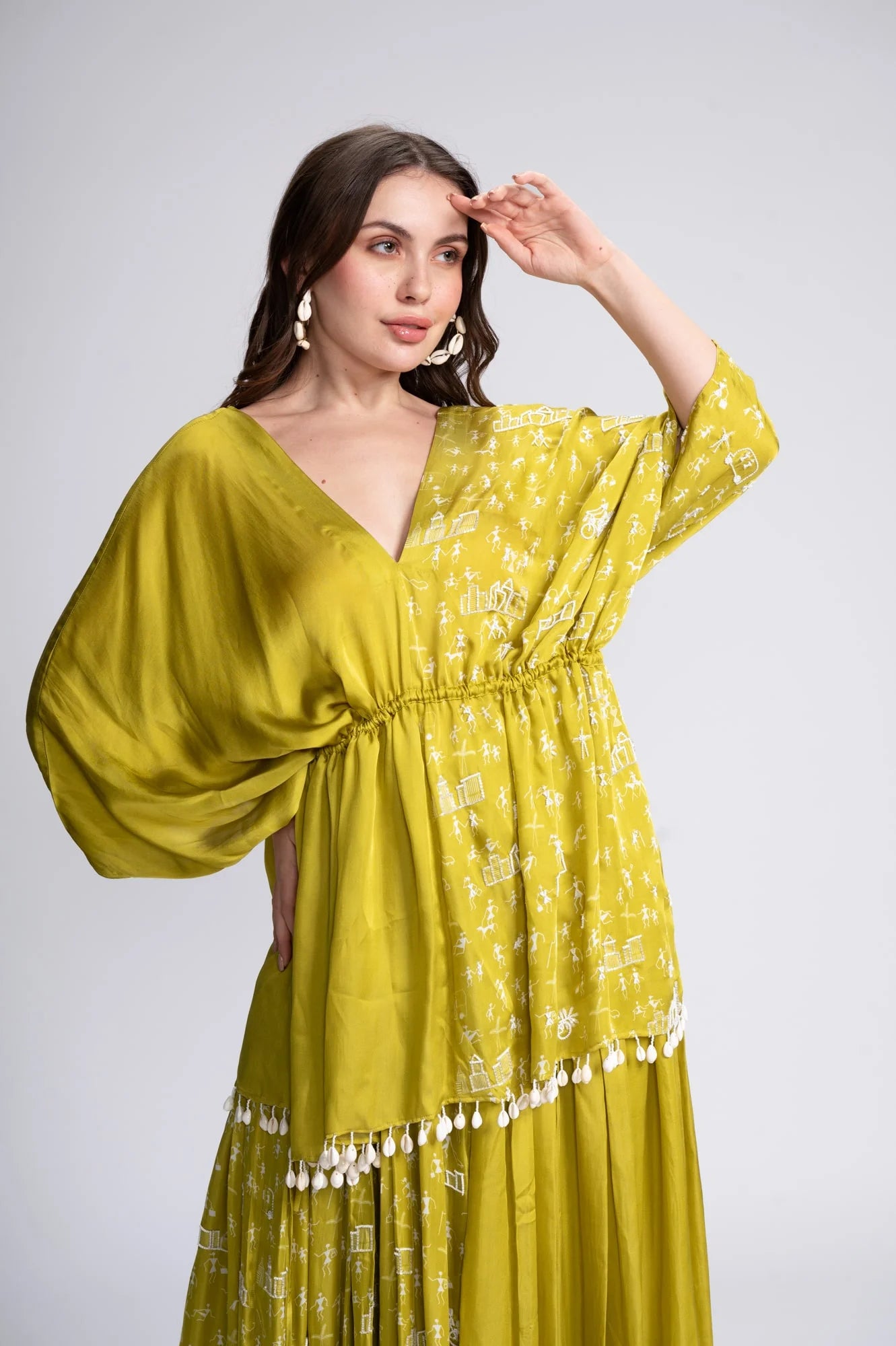 | Featuirng a satin base sharara set in mustard green with warli art digital print. Hand embroidered with beads, sequins and cutdana, it captivates with its deep v neckline. |