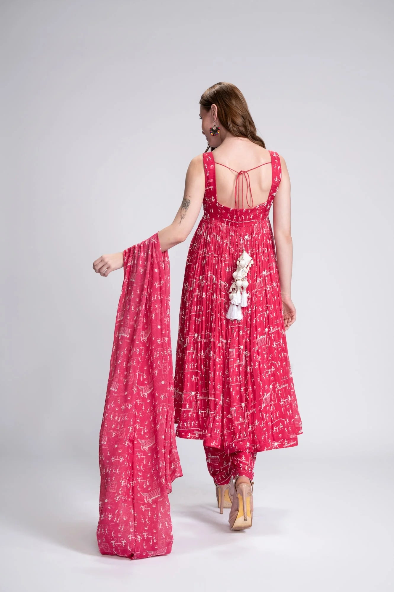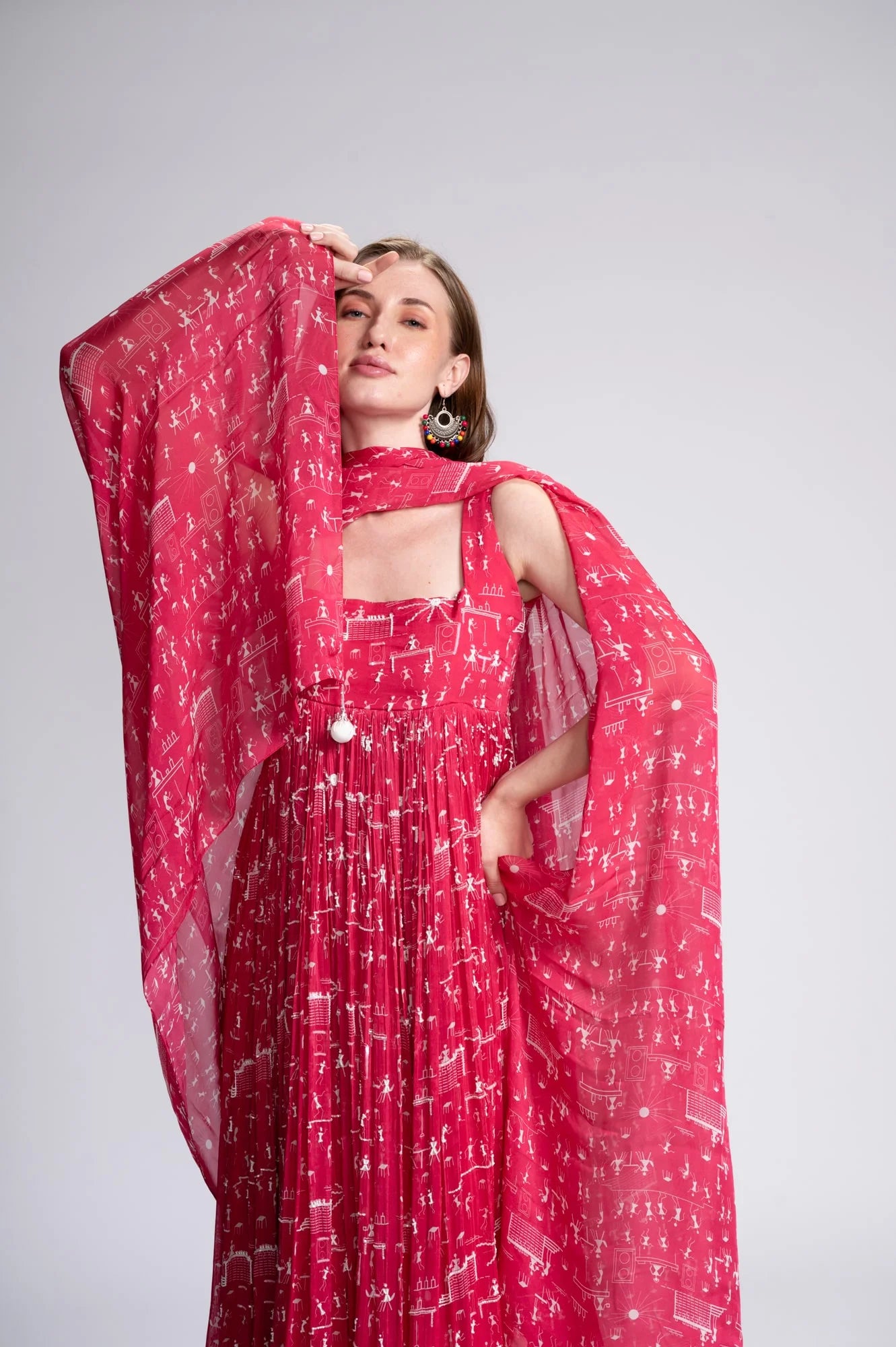| Featuring a rose pink warli print anarkali in tabby silk with beads, cutdana and sequins hand embroidery. It is paired with matching pants and dupatta, embellished with kaudi, cones and tassles. |