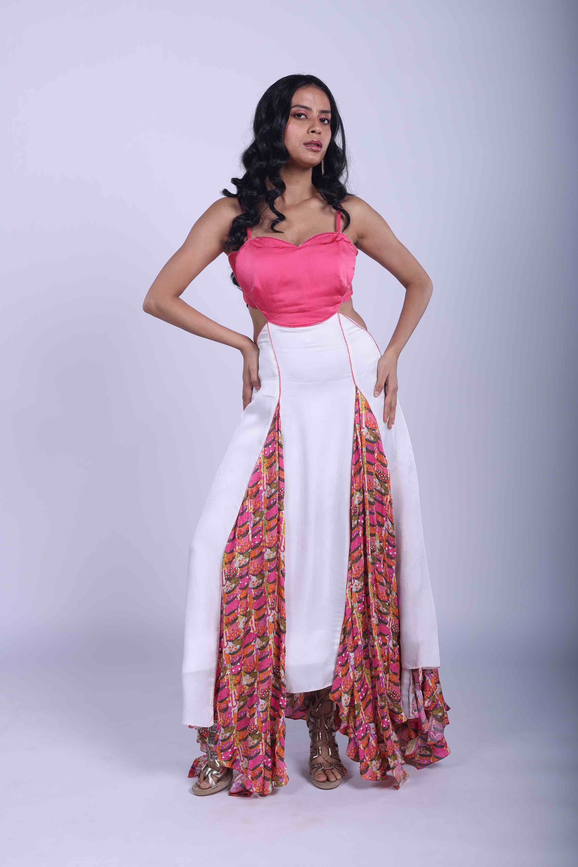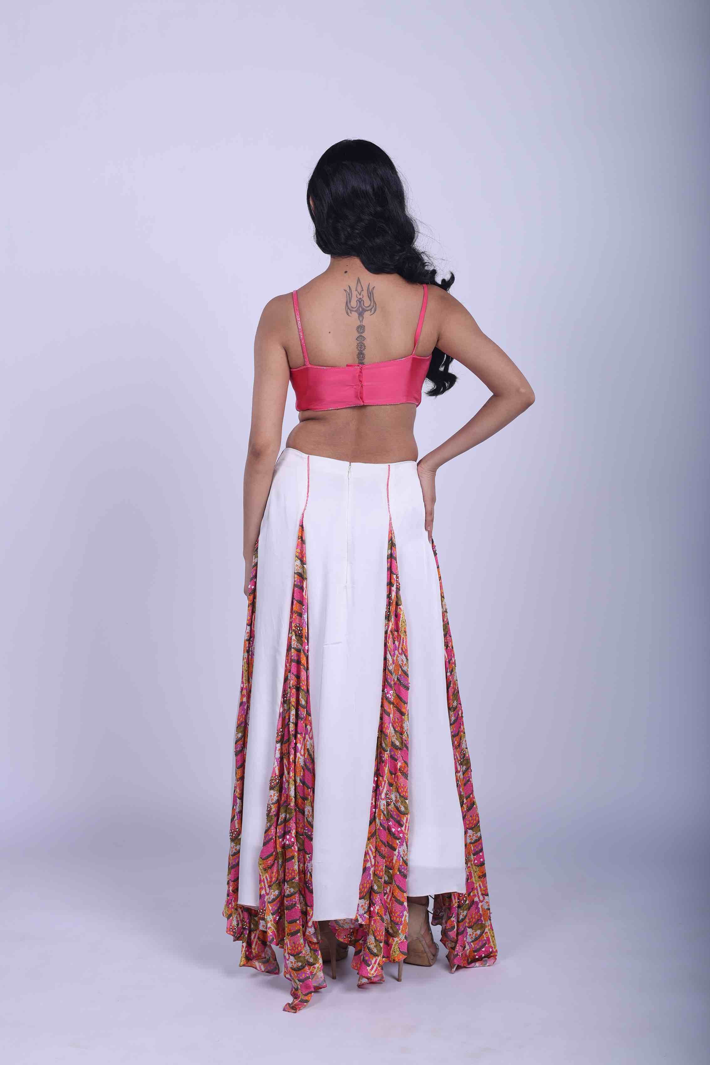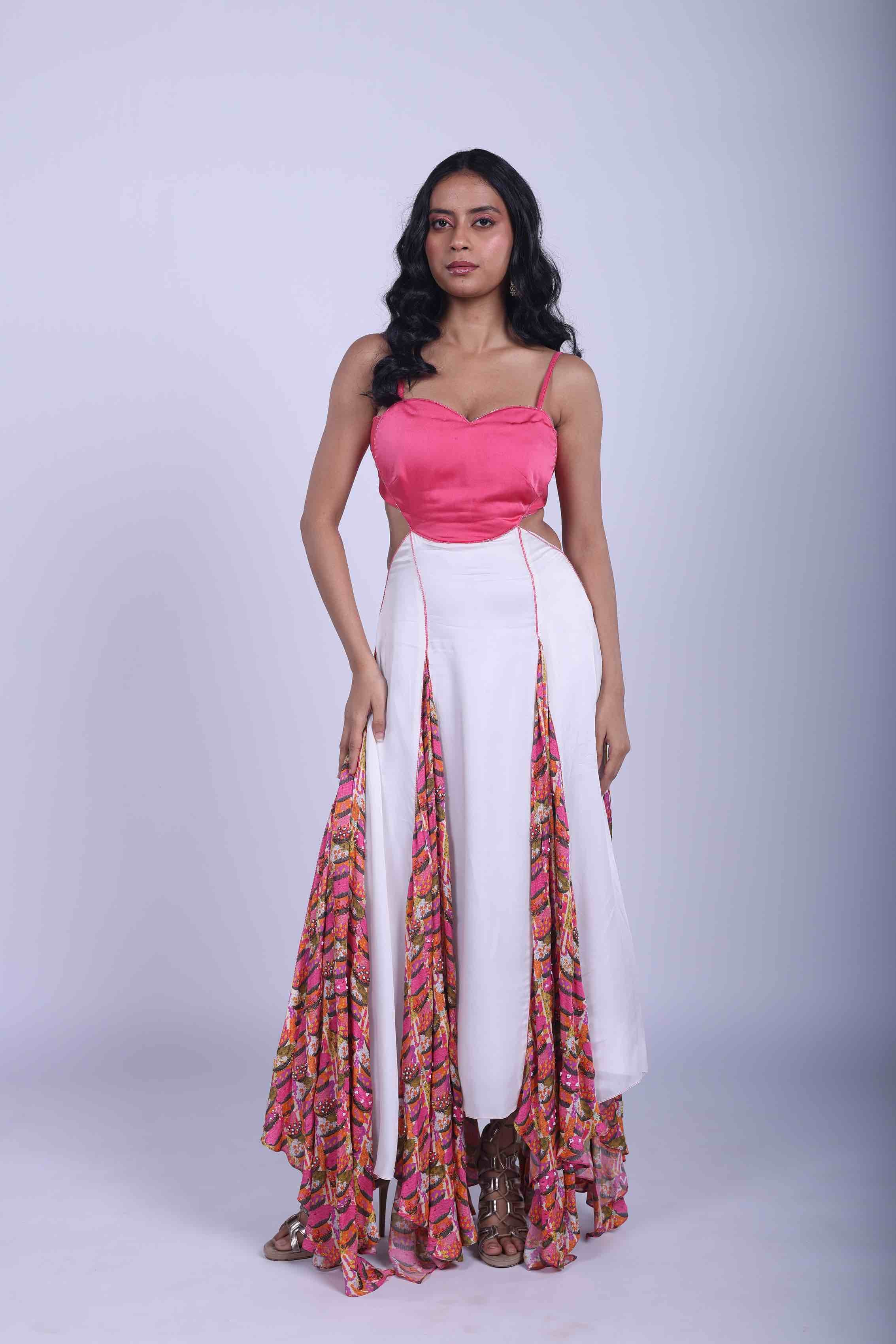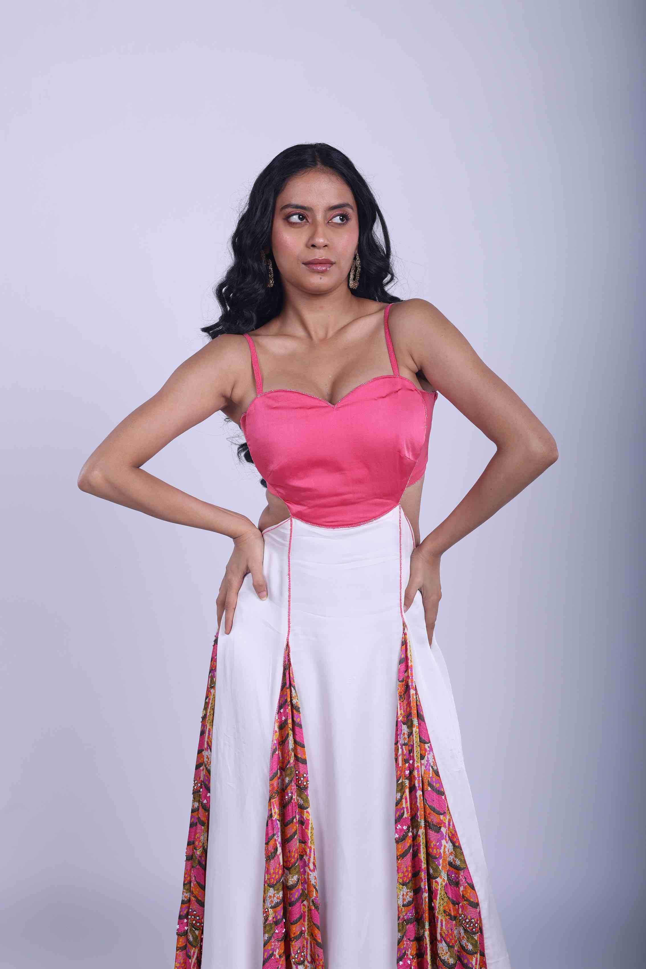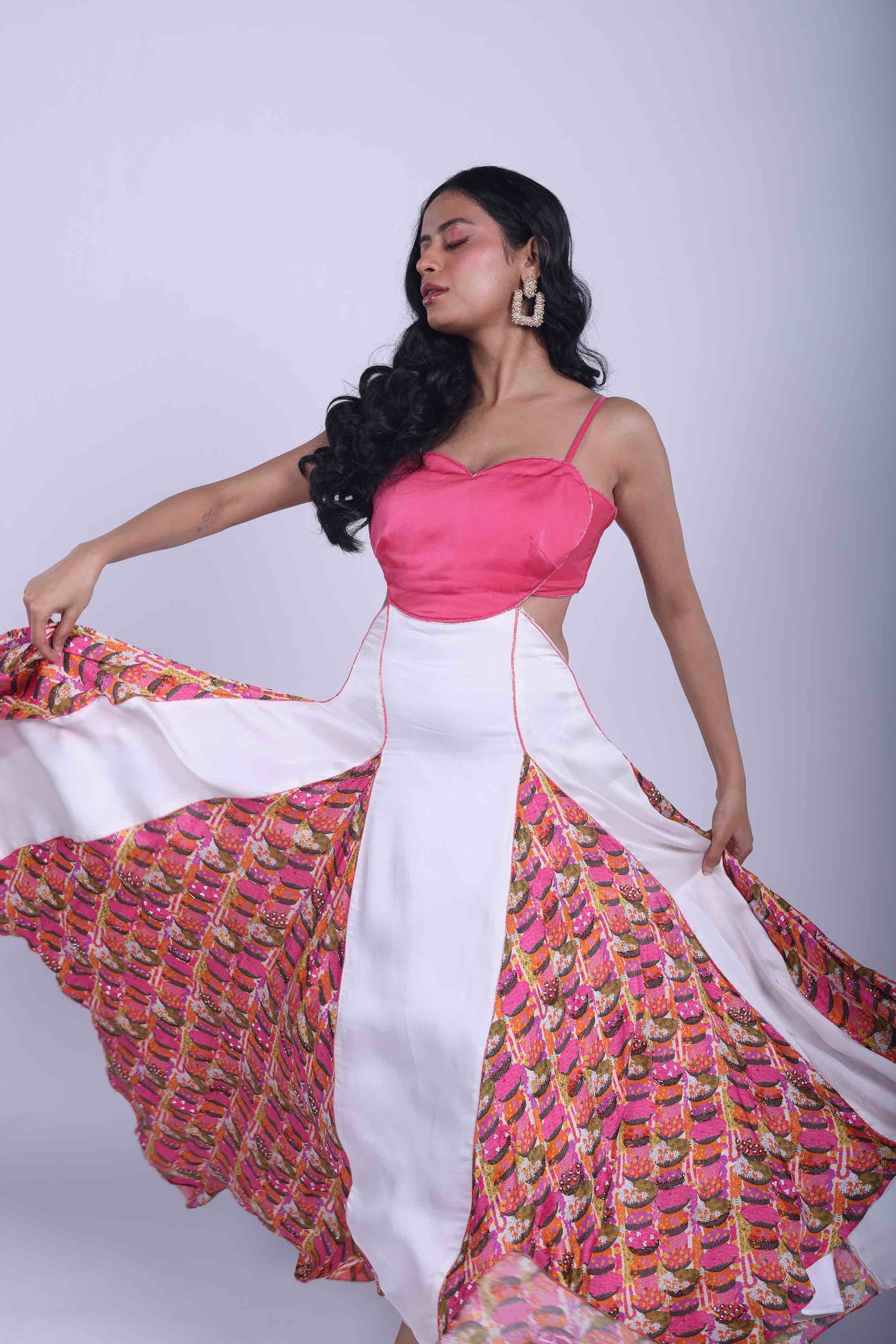 Featuring a tulip white and multicolour satin gown with Phool Basket print. Hand embroidered with cutdana, tokri sequins, poth and anchor thread. |