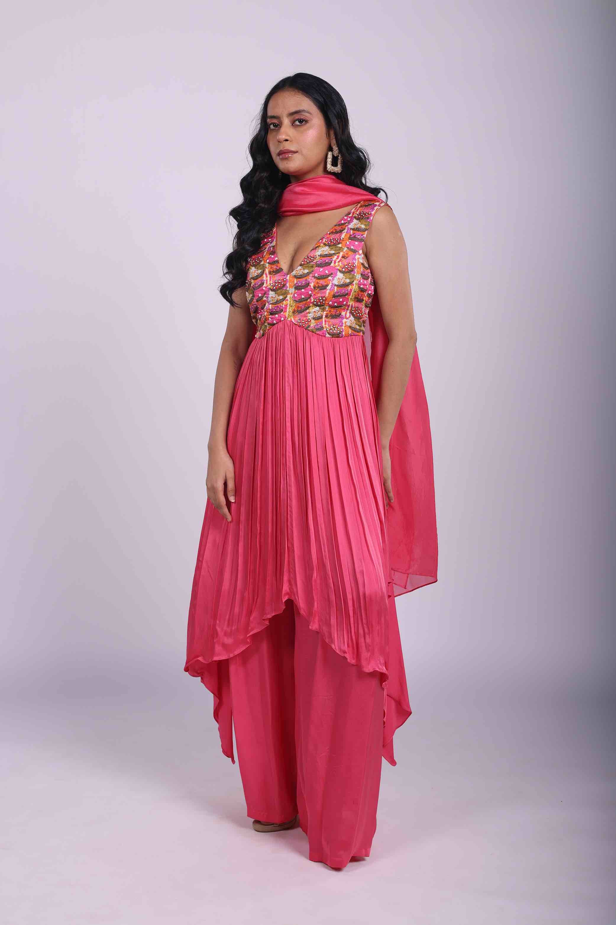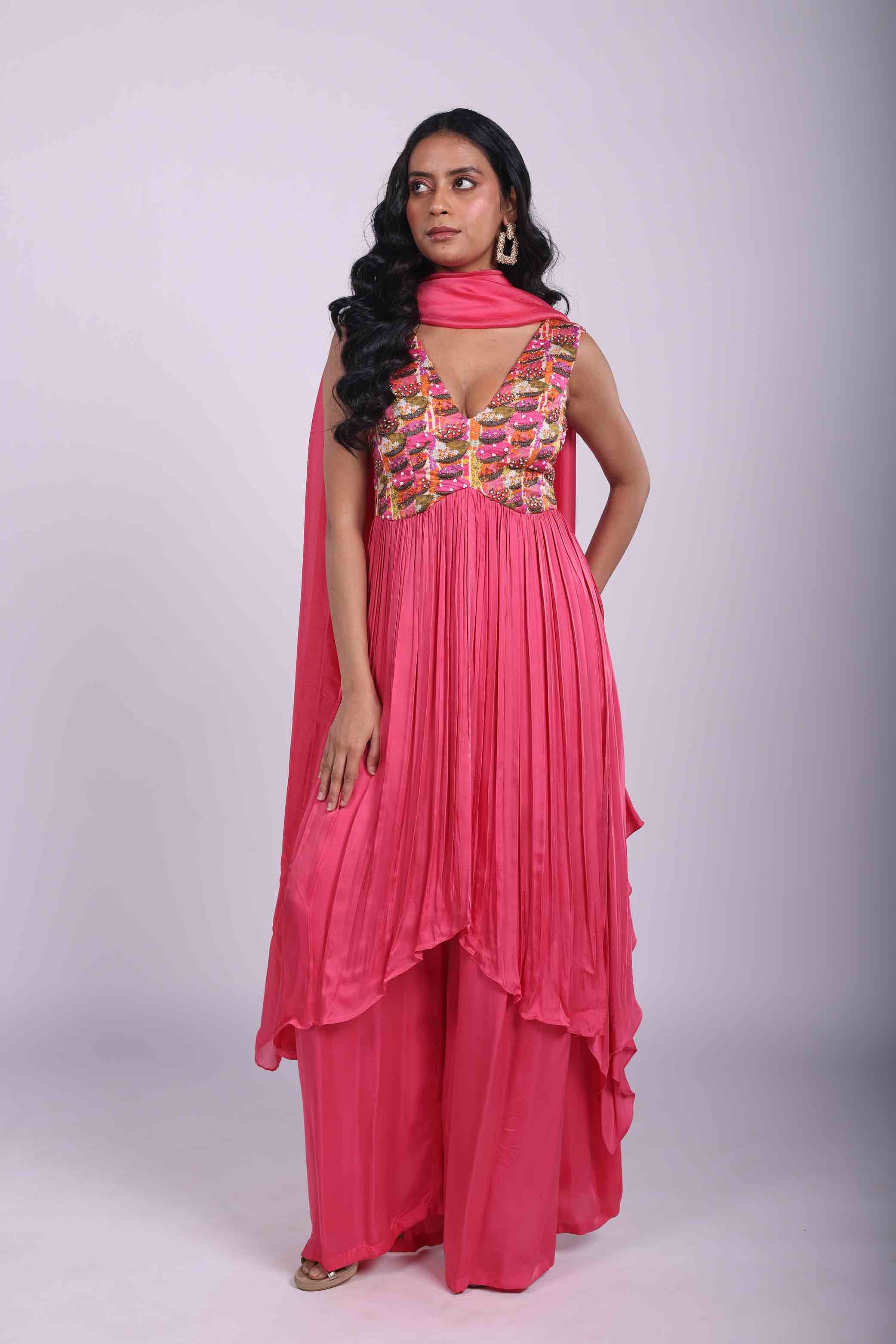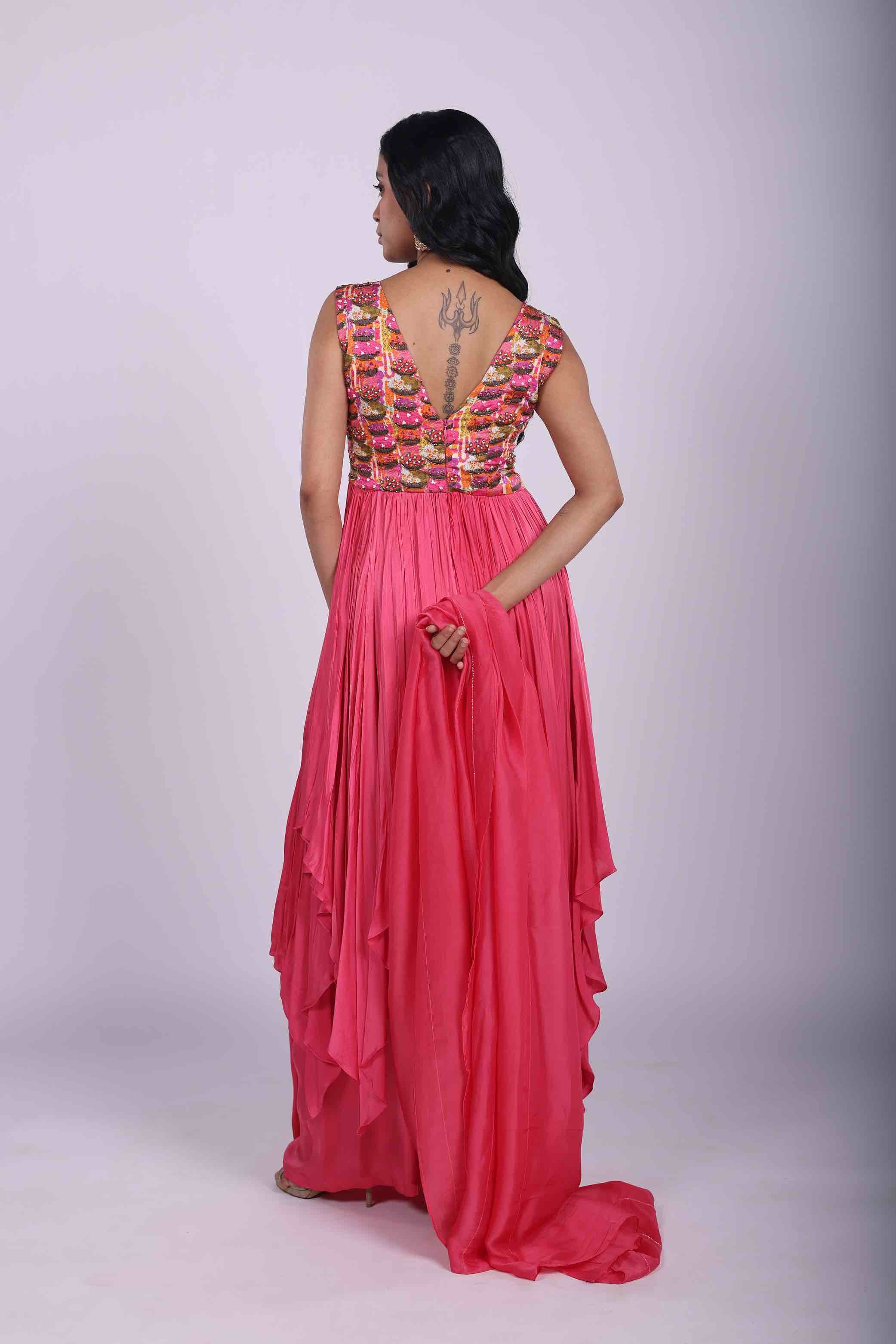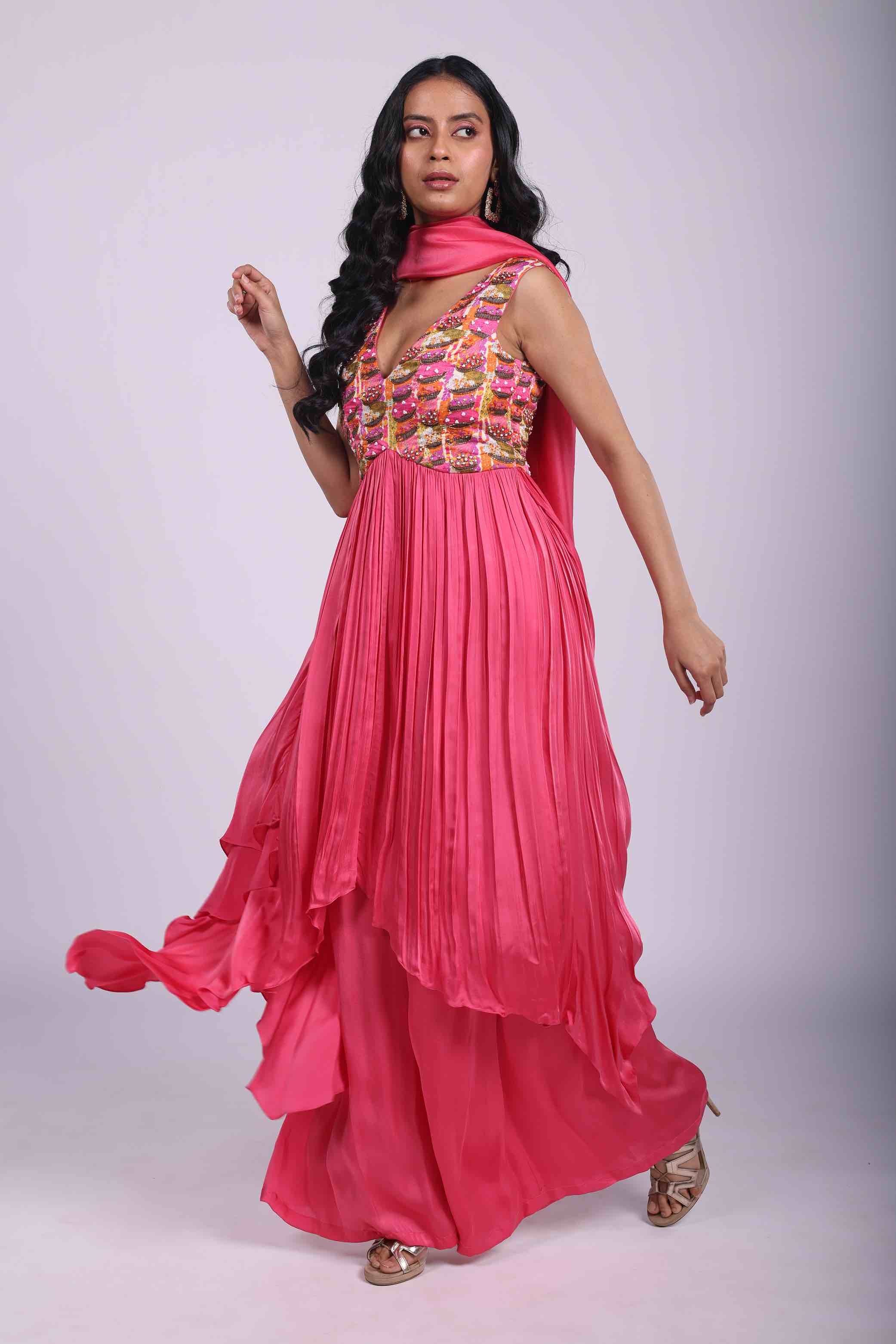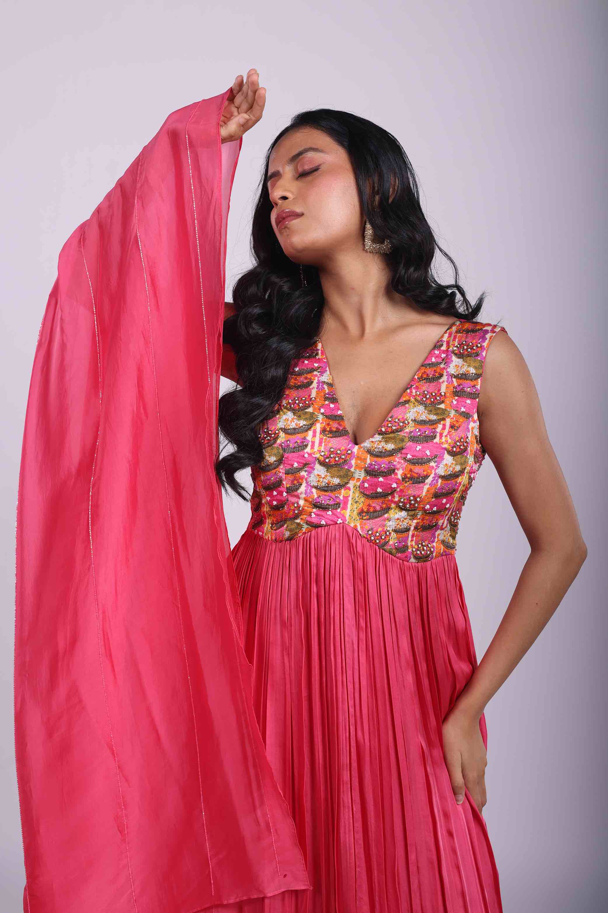 Featuring a peony pink and multicolour anarkali set in satin with Phool Basket print. Hand embroidered with cutdana, tokri sequins, poth and anchor thread, it is paired with a dupatta in organza. |