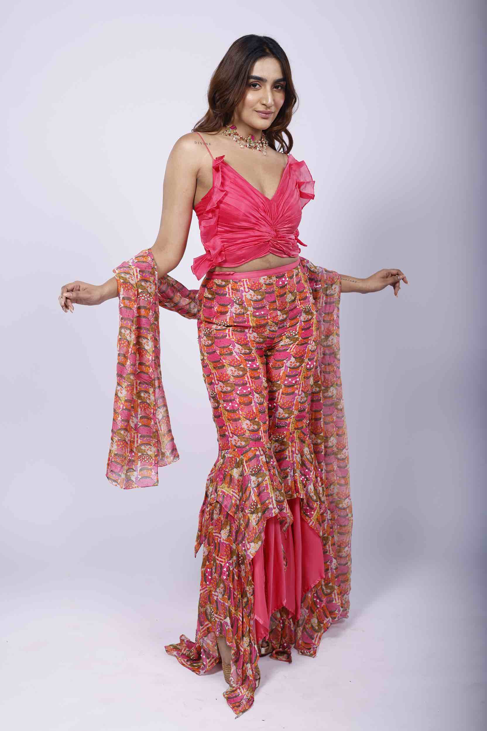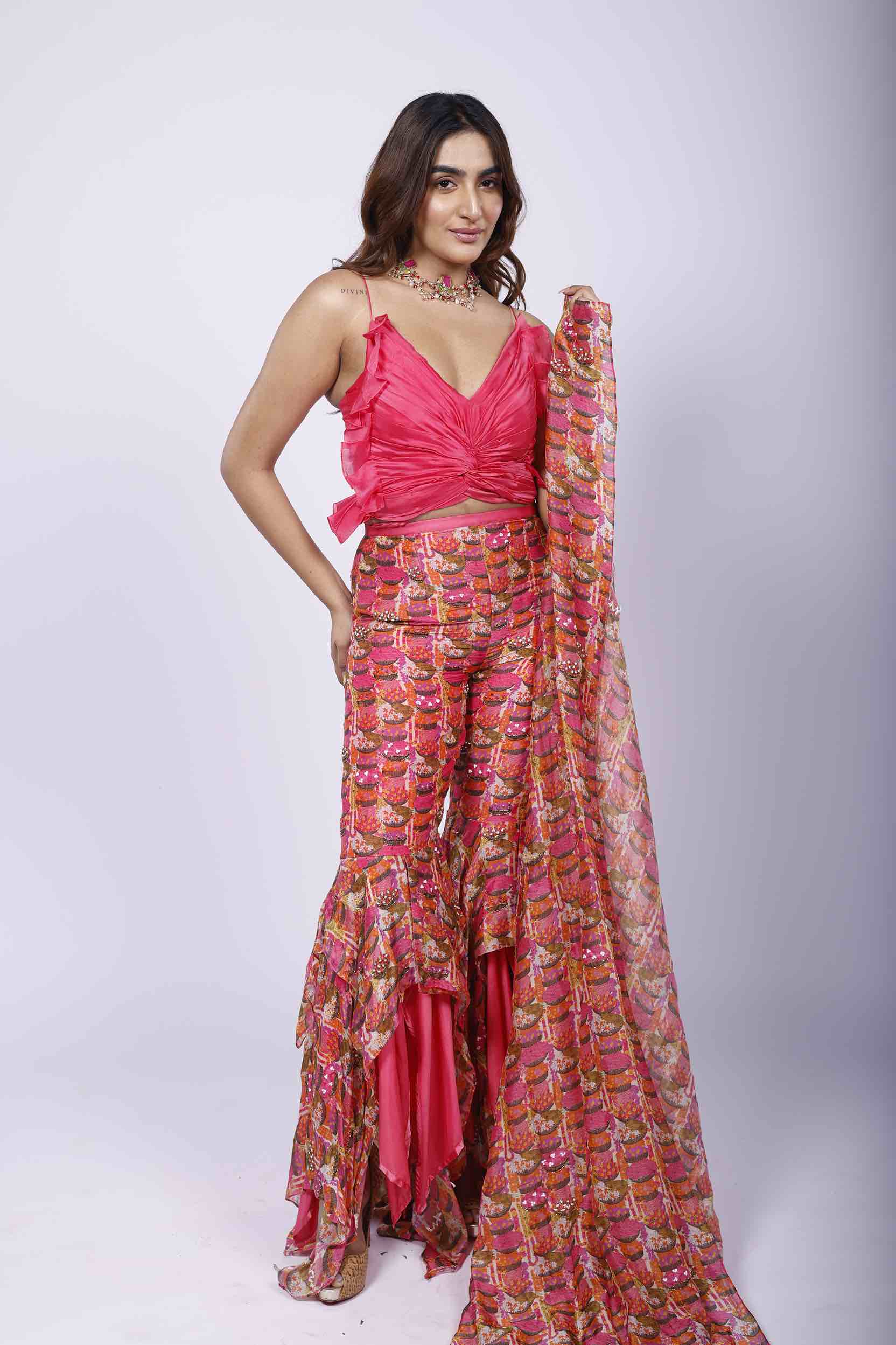 Featuring a multicolour sharara set in organza with Phool Basket print. Hand embroidered with cutdana, tokri sequins, poth and anchor thread, it is paired with a peony pink v-neck blouse and printed dupatta. |