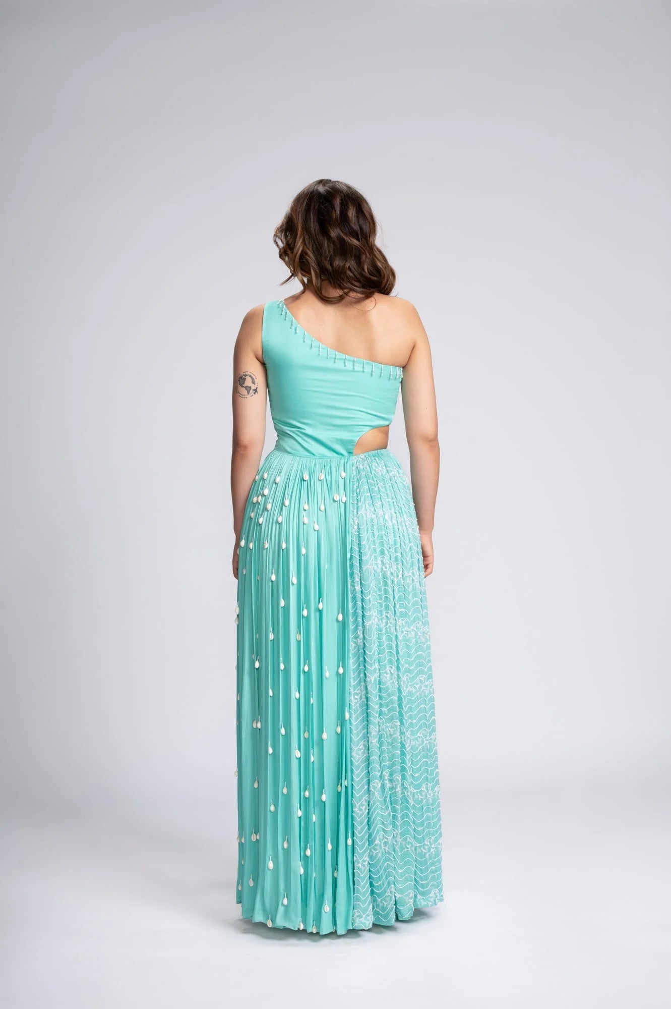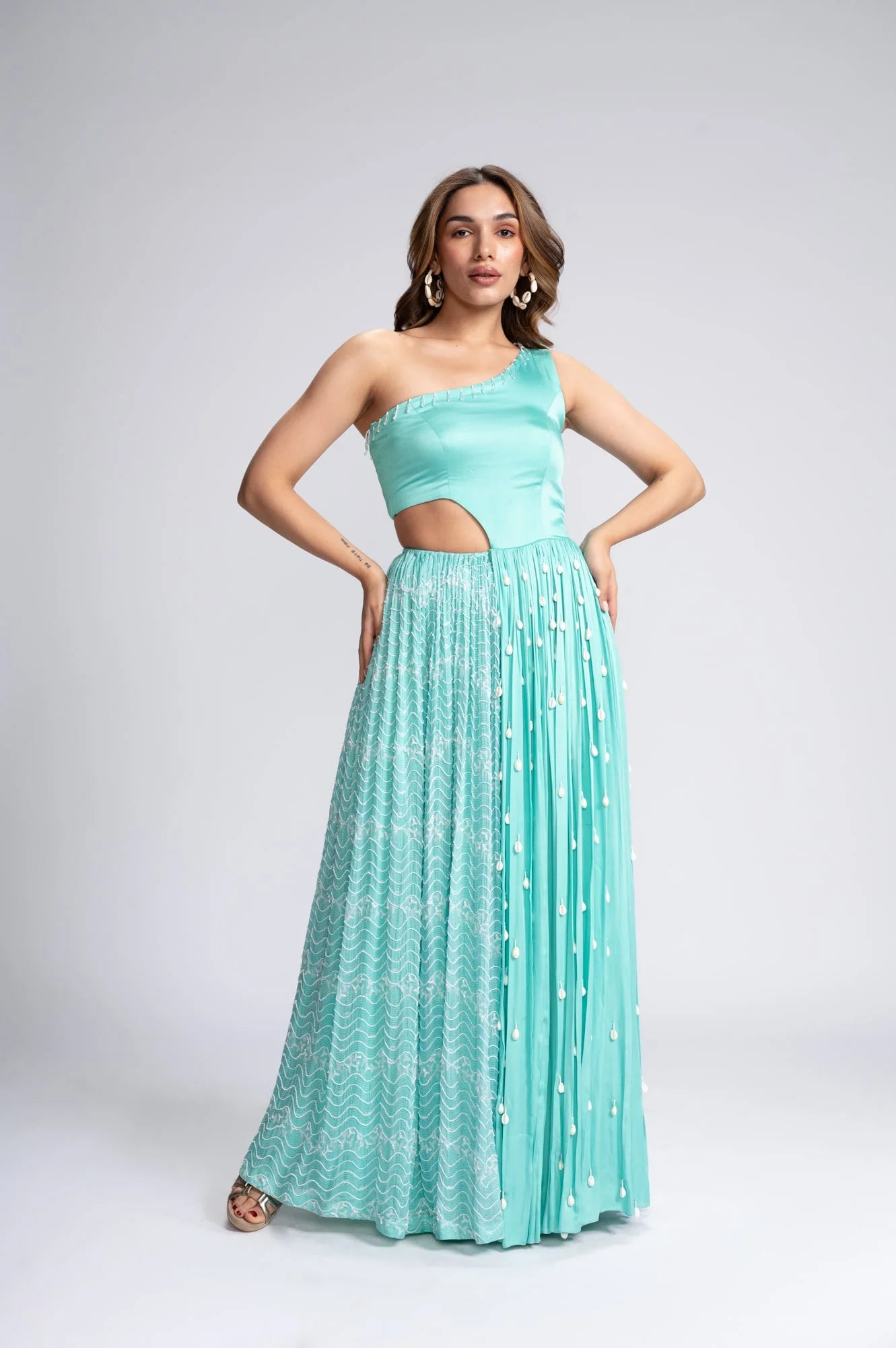 | Featuring an aqua blue gown with warli art in white digital print. Crafted in satin and tabby silk, this one shoulder gown is hand embroidered with beads and cutdana. Embellished with kaudis it captivates with its elegance. |