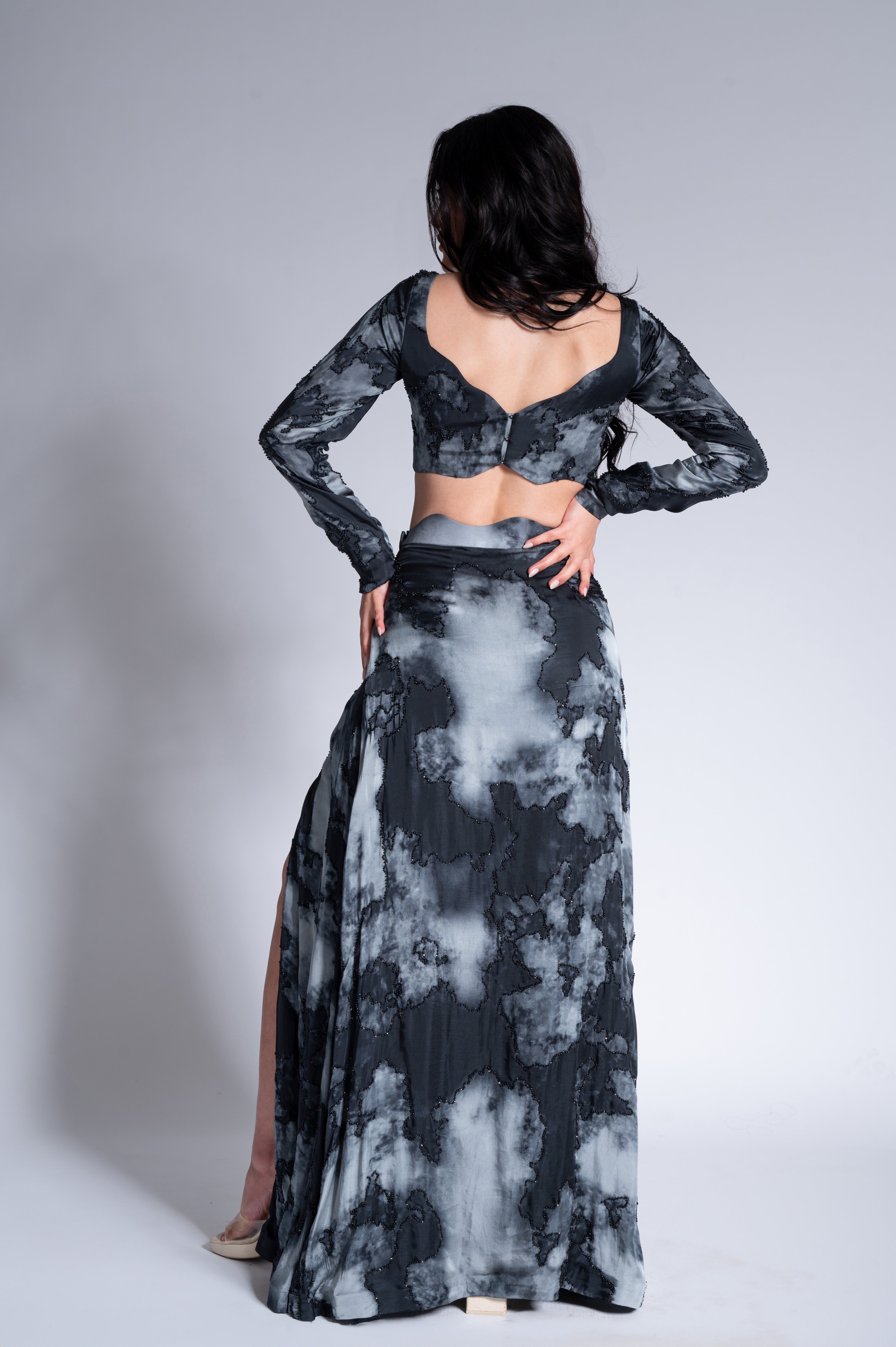 | Featuring a printed black and argent grey three piece lehenga set with embroidery and detachable choker. |