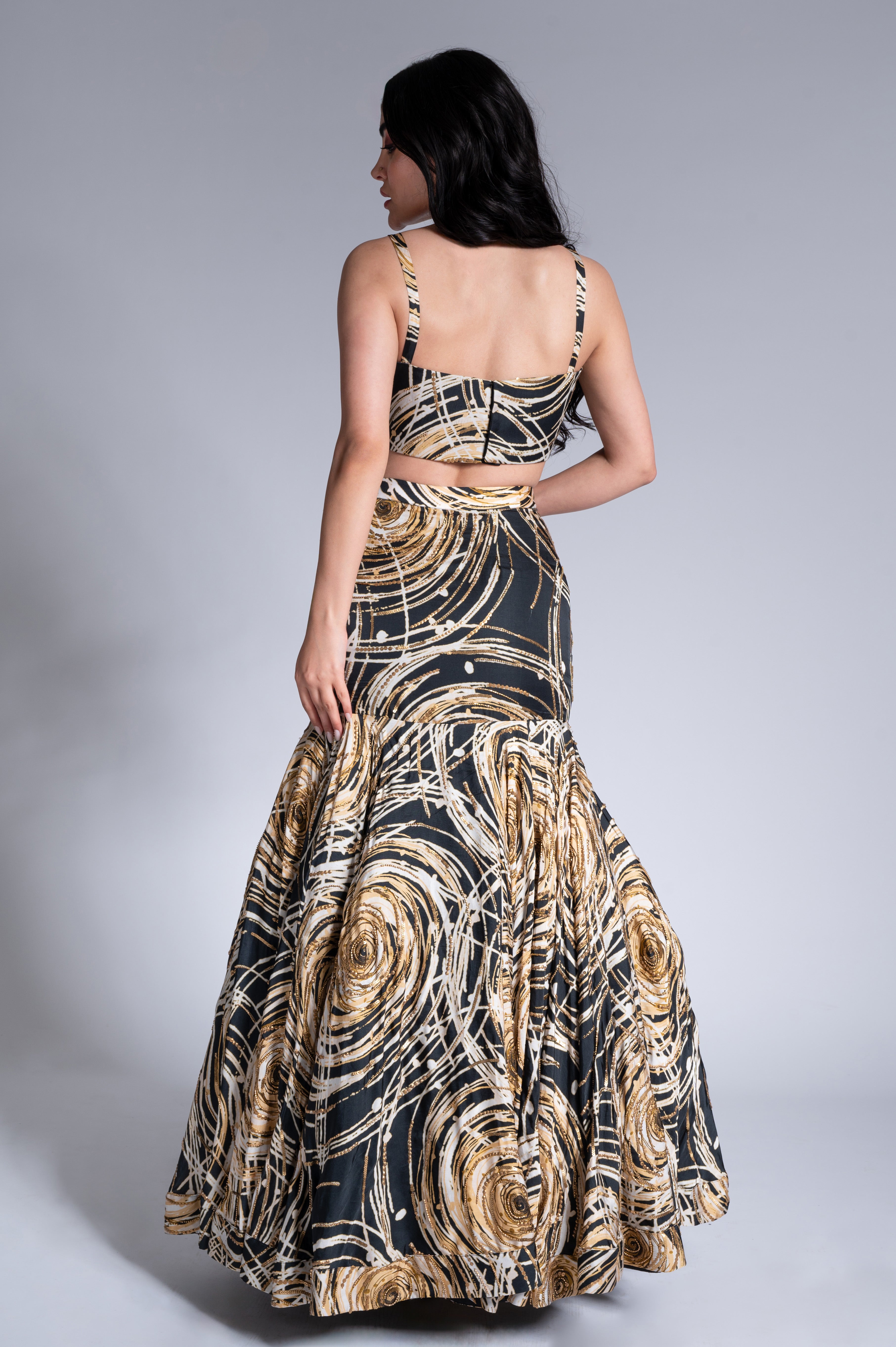 | Featuring a printed black and wheat gold three piece lehenga set with embroidery and detachable choker. |