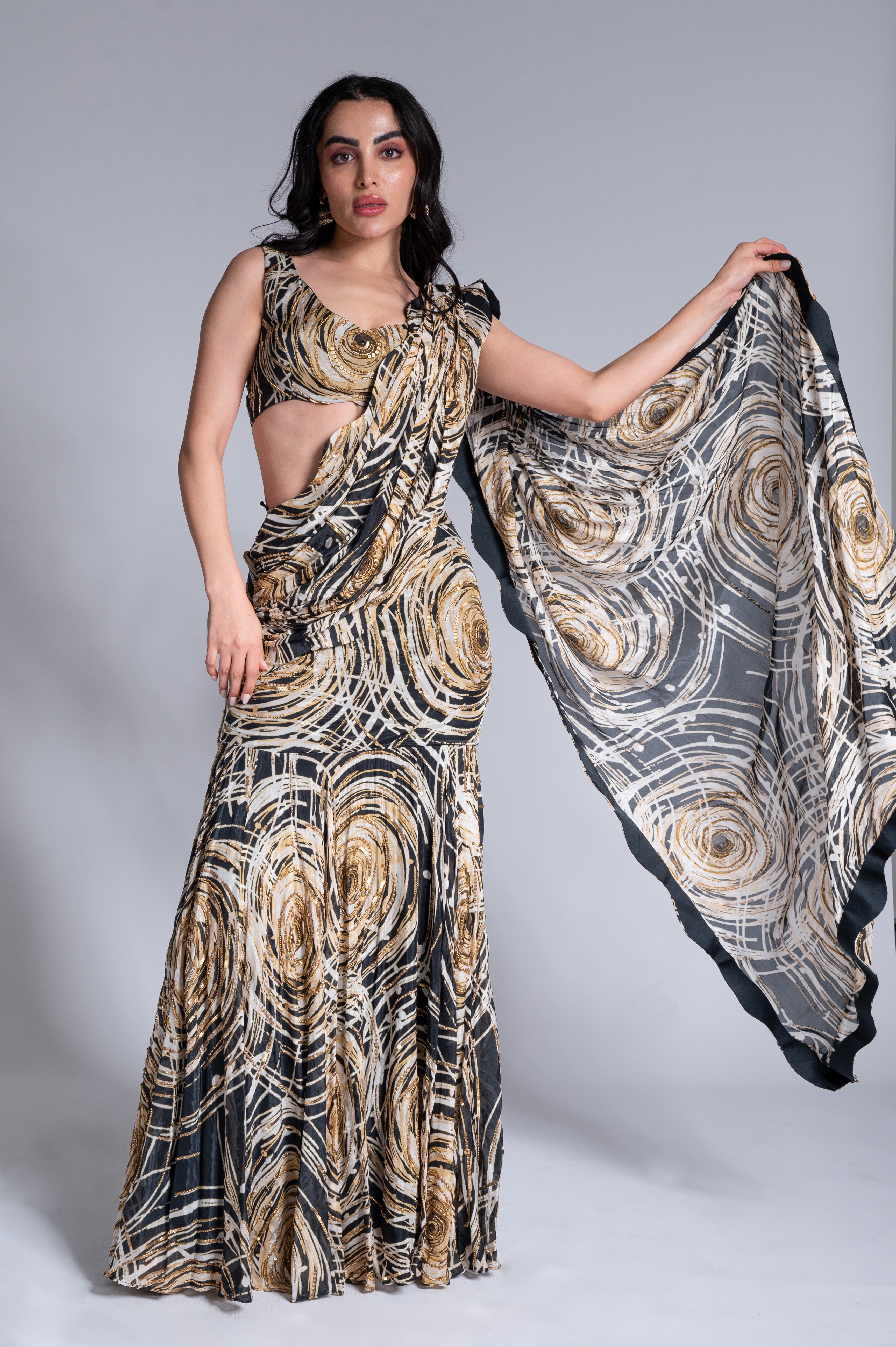 | Featuring a printed black and wheat gold pre-draped saree set with embroidery. |